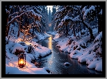 Zima, Rzeka, Lampa, Las, Drzewa, Grafika AI