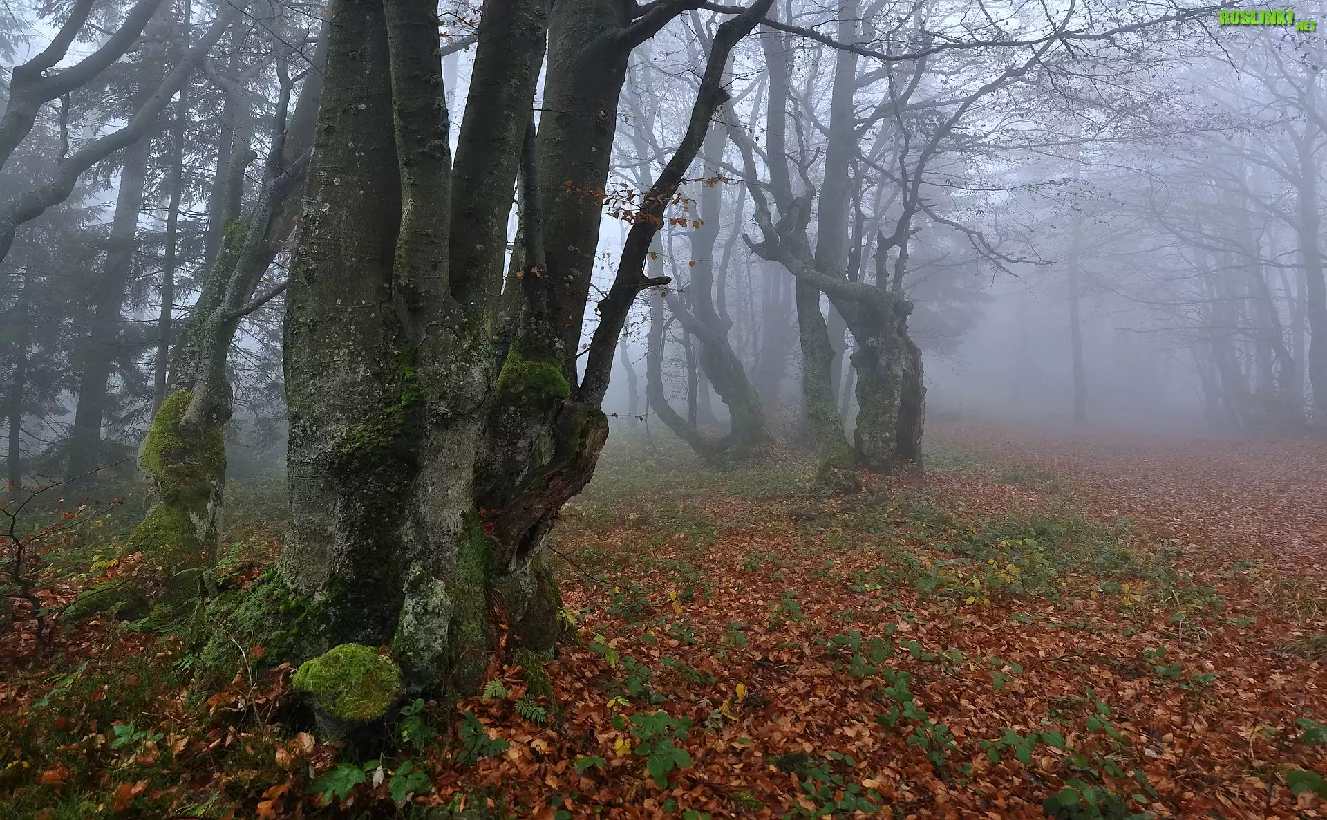 Rośliny: Las, Jesień, Drzewa, Opadłe, Liście, Mgła
