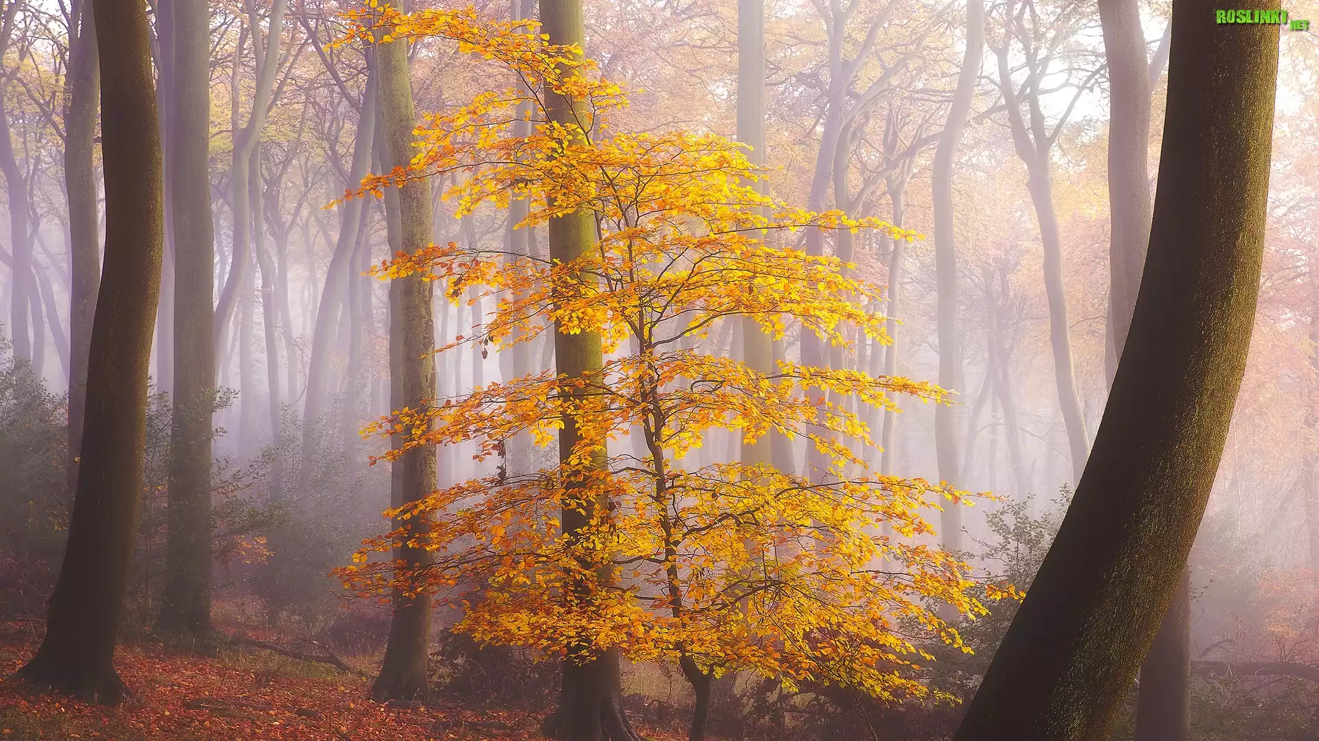 Rośliny: Las, Jesień, Mgła, Drzewo, Liście, Żółte