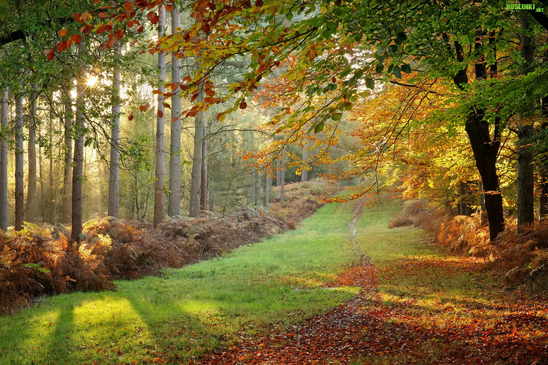 Rośliny: Las, Drzewa, Paprocie, Jesień, Liście, Roślinność