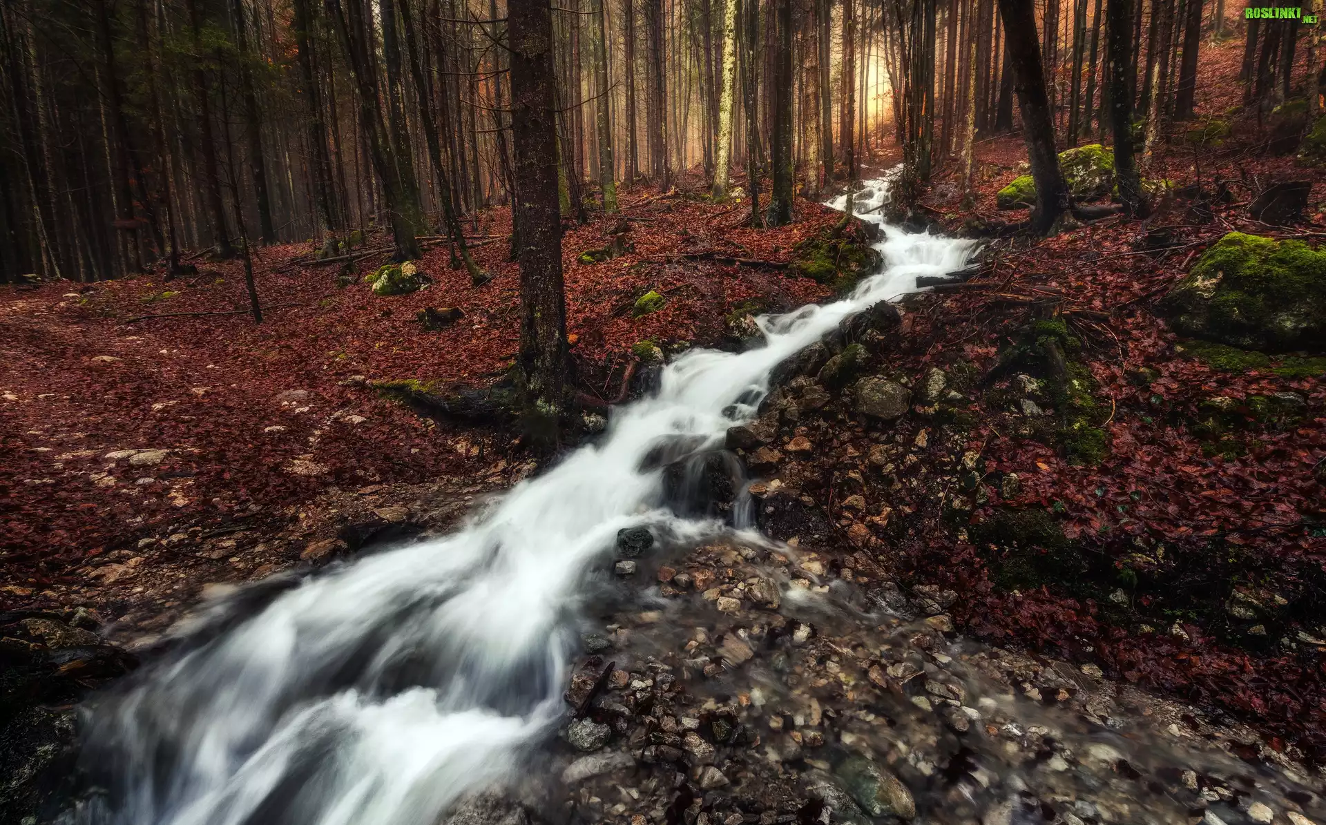 Rośliny: Las, Drzewa, Strumyk, Kamienie, Liście, Jesień