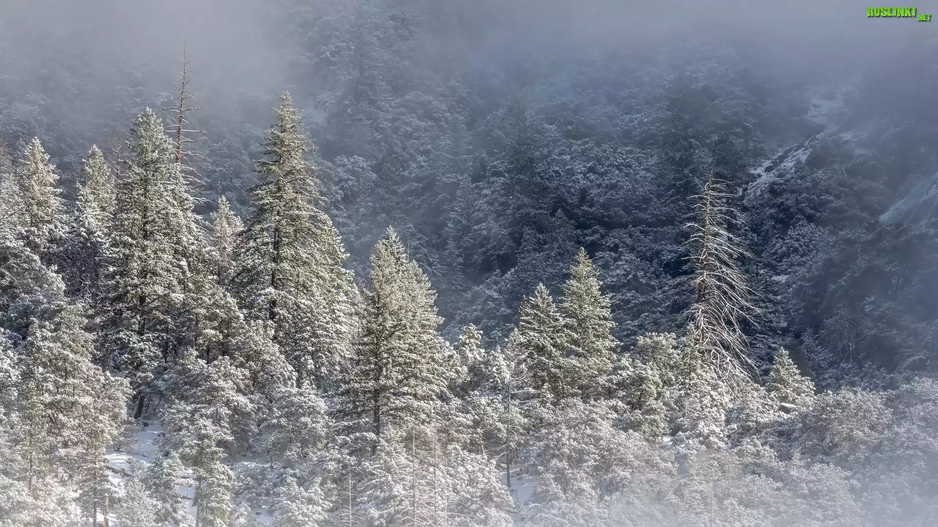 Rośliny: Zima, Śnieg, Drzewa, Las, Góry, Mgła