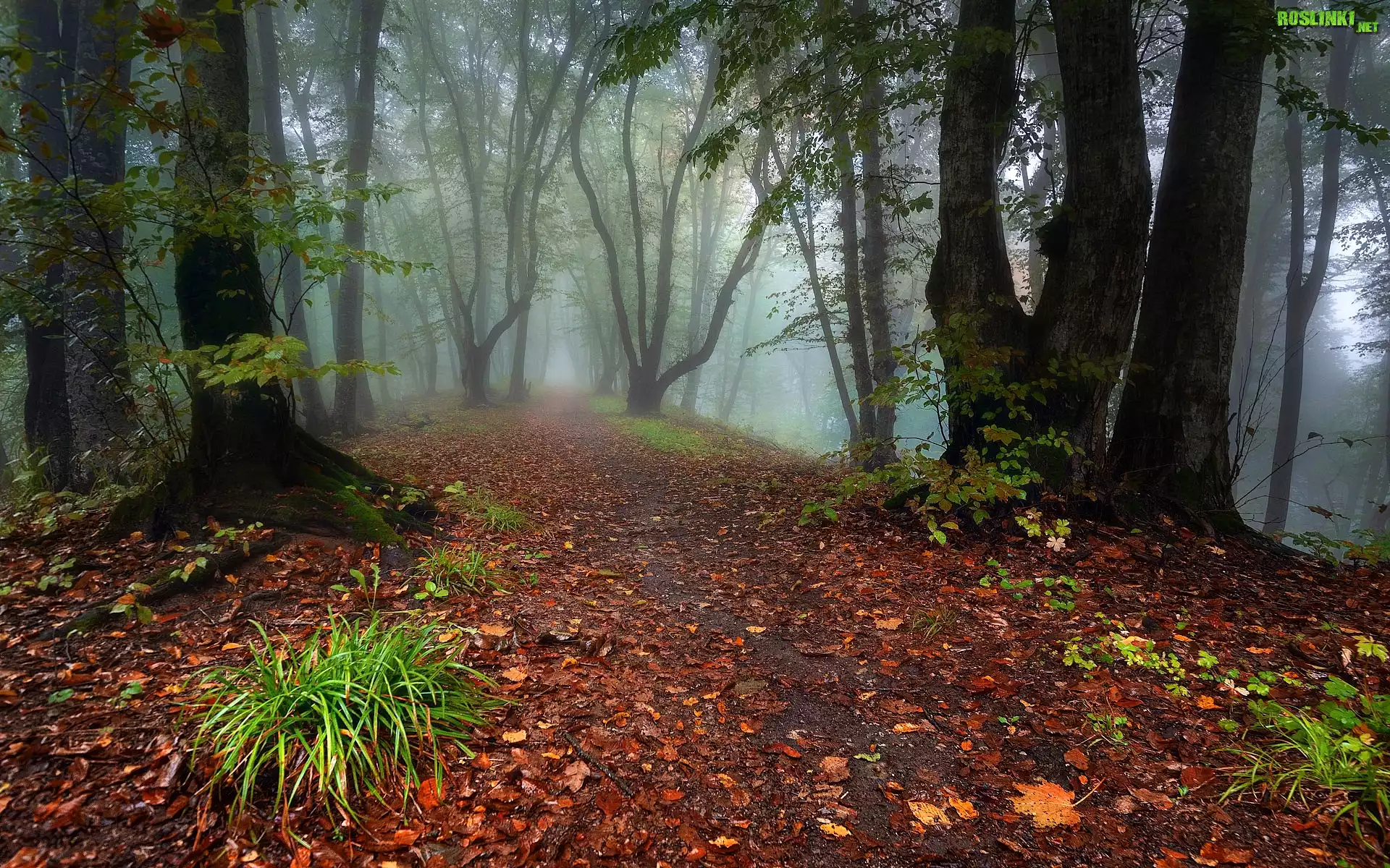 Rośliny: Las, Drzewa, Kępki, Trawy, Mgła, Liście