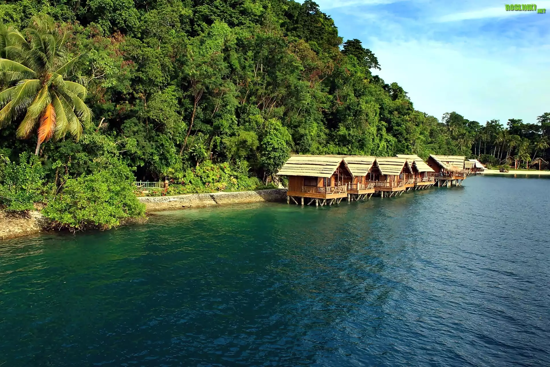 Morze, Las, Domki, Na Wodzie, Palmy, Tropiki