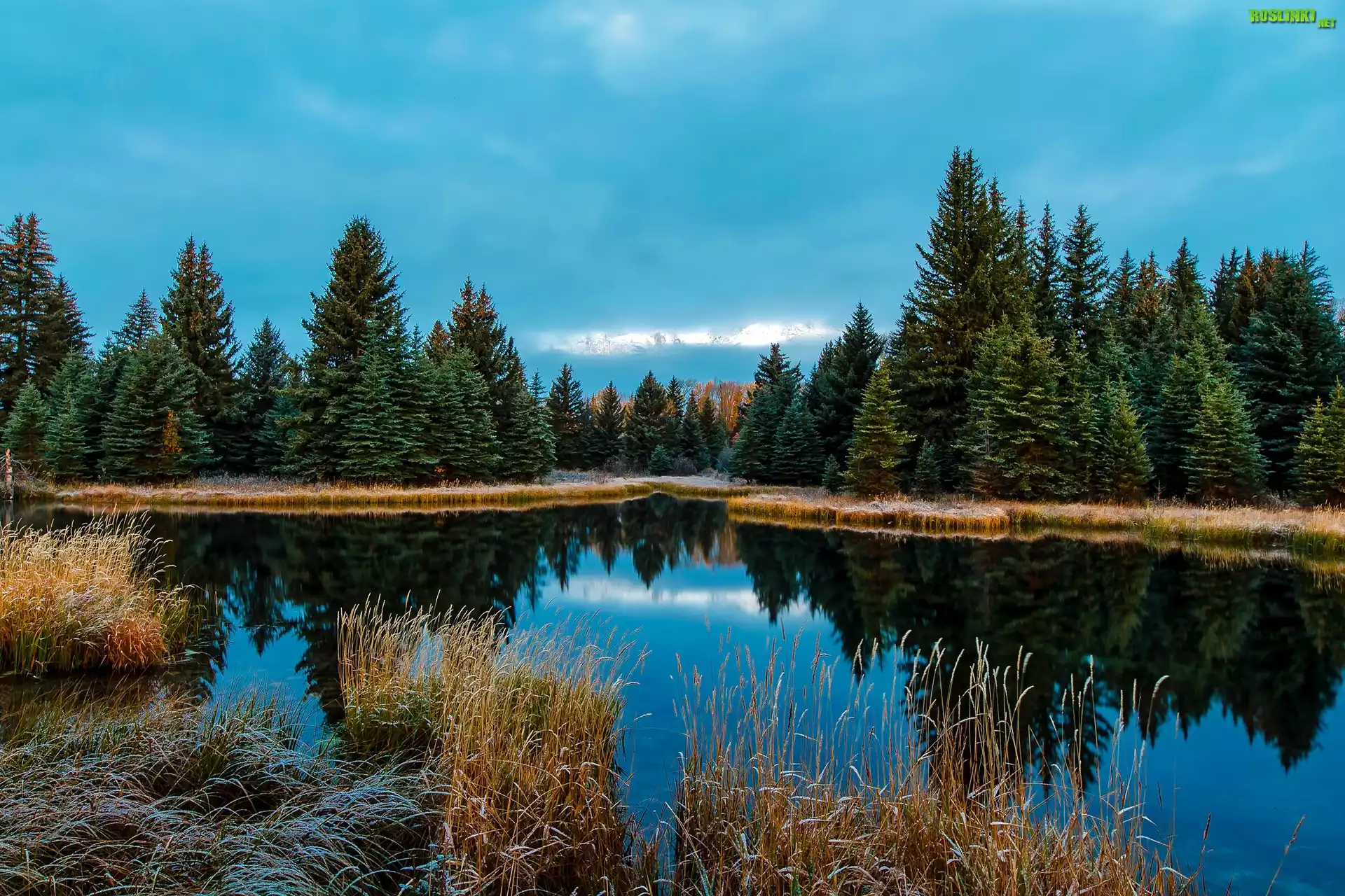 Rośliny: Las, Świerki, Trawa, Rzeka, Odbicie, Jesień