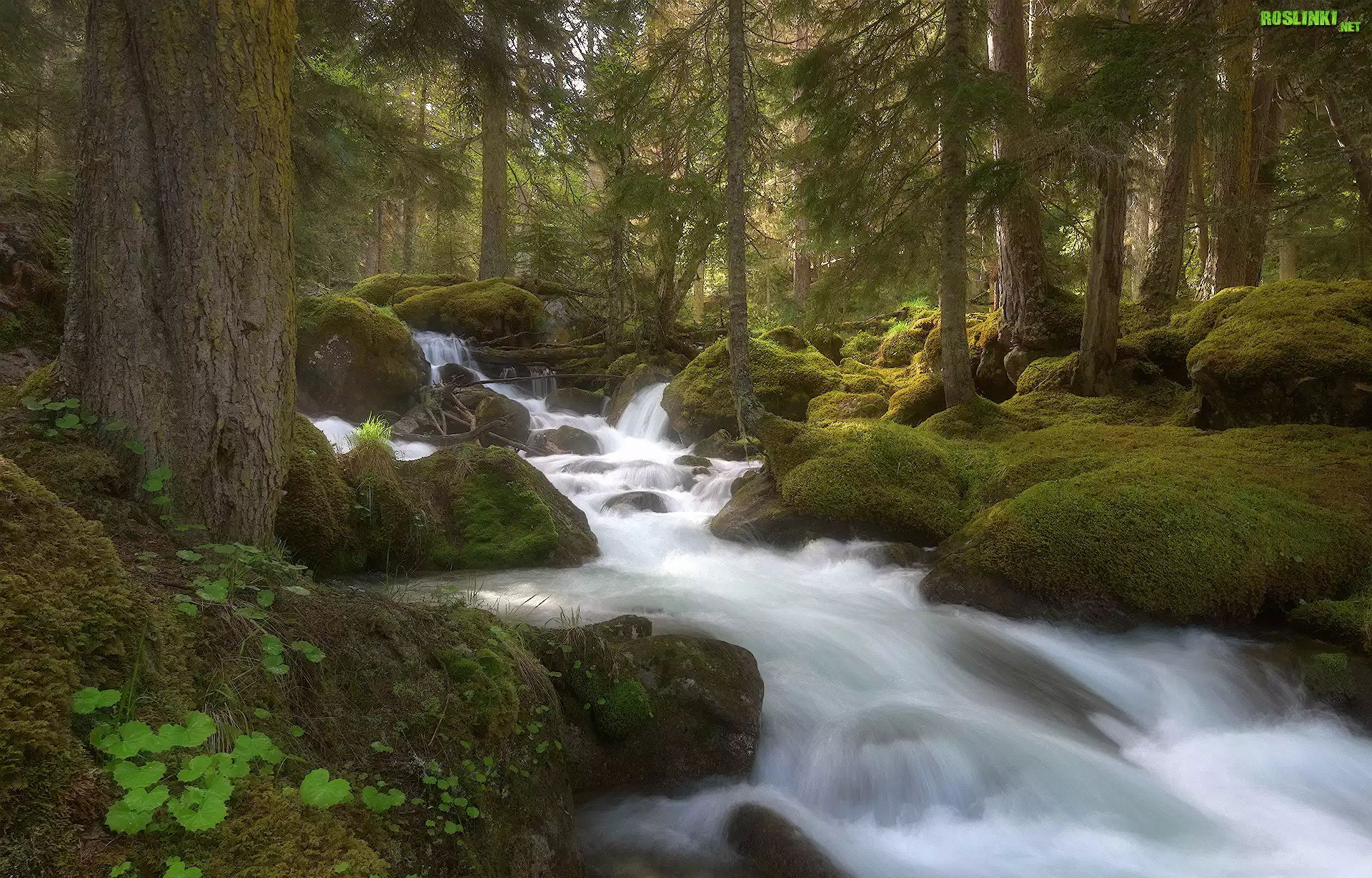 Rośliny: Las, Drzewa, Strumyk, Rzeka, Omszałe, Kamienie