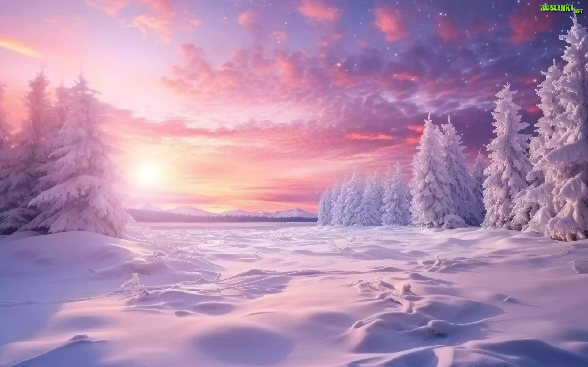Rośliny: Zima, Drzewa, Ośnieżony, Las, Wschód słońca, Chmury