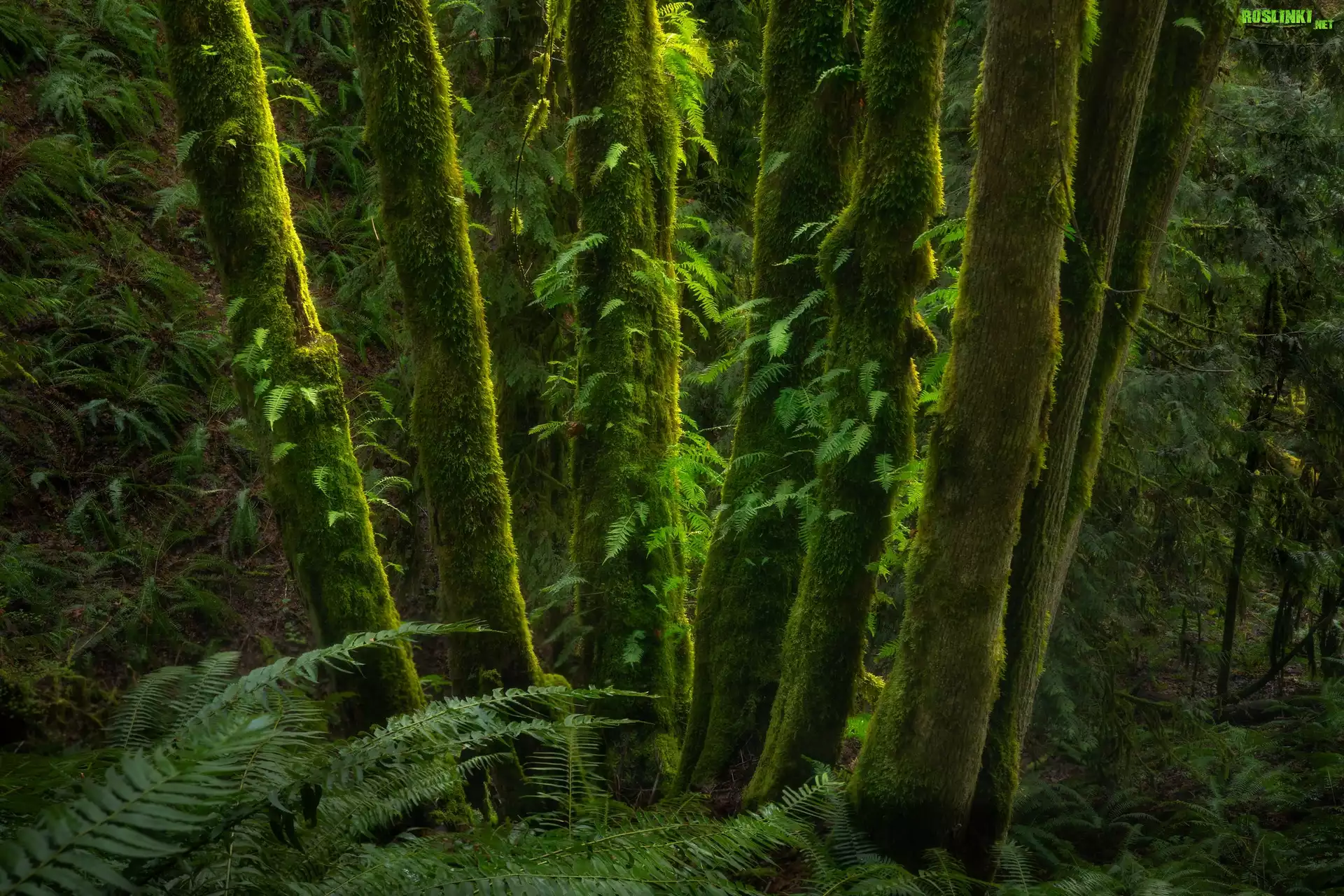 Rośliny: Las, Drzewa, Omszałe, Pnie, Paprocie