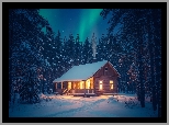Zima, Dom, Drzewa, Las, Zorza polarna