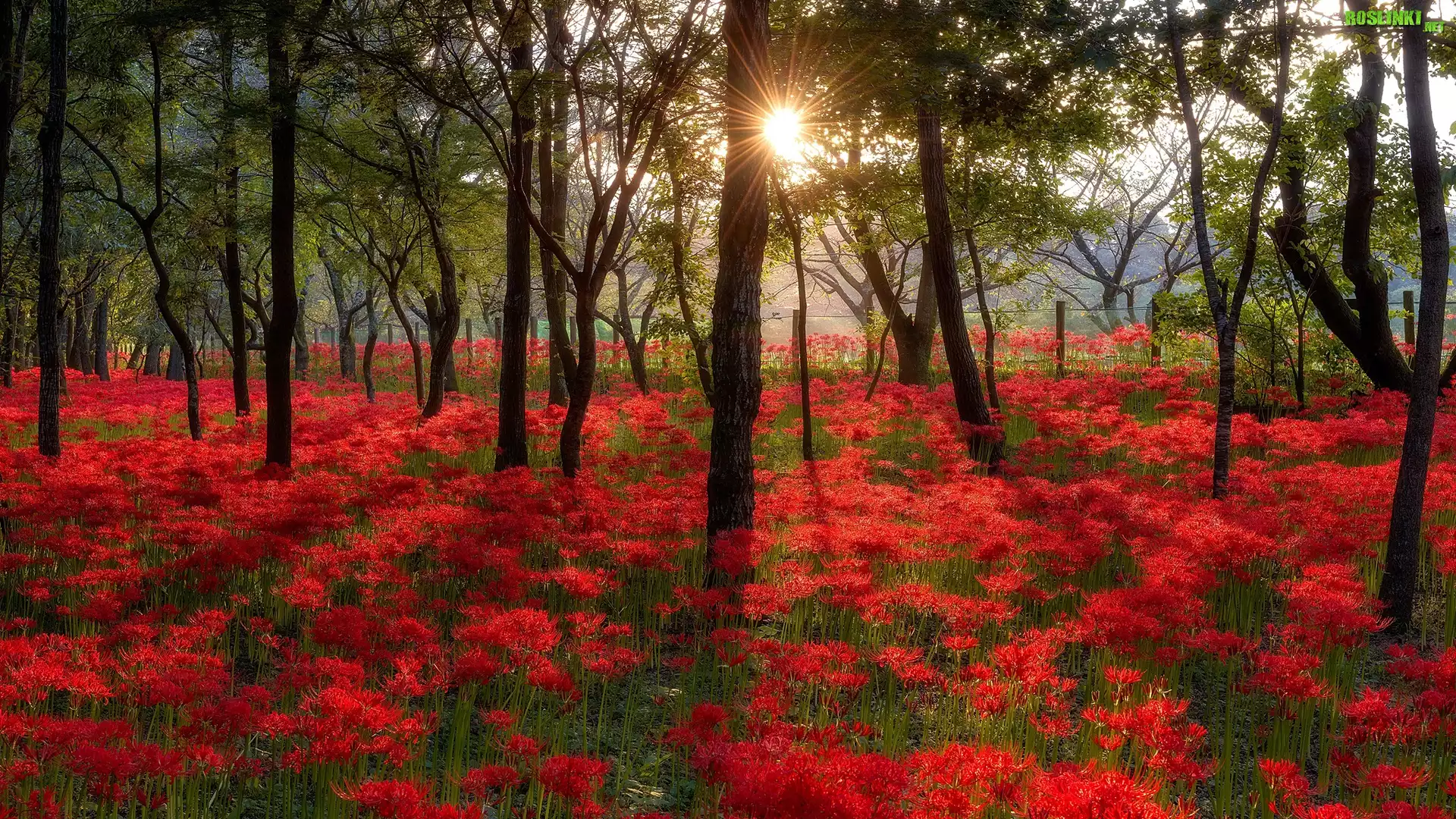 Las, Drzewa, Czerwone, Kwiaty, Promienie słońca
