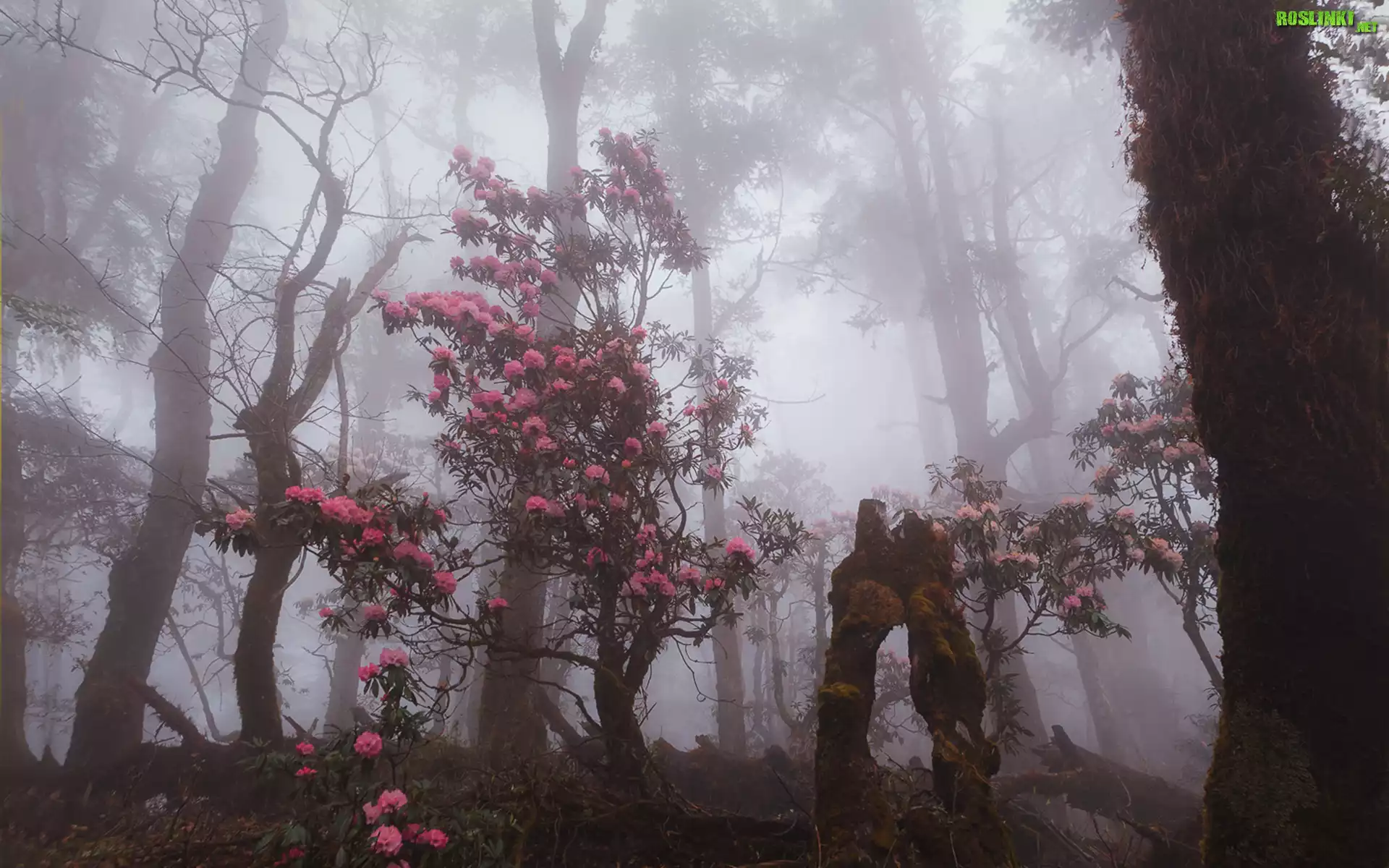 Rośliny: Las, Drzewa, Krzewy, Rododendron, Mgła