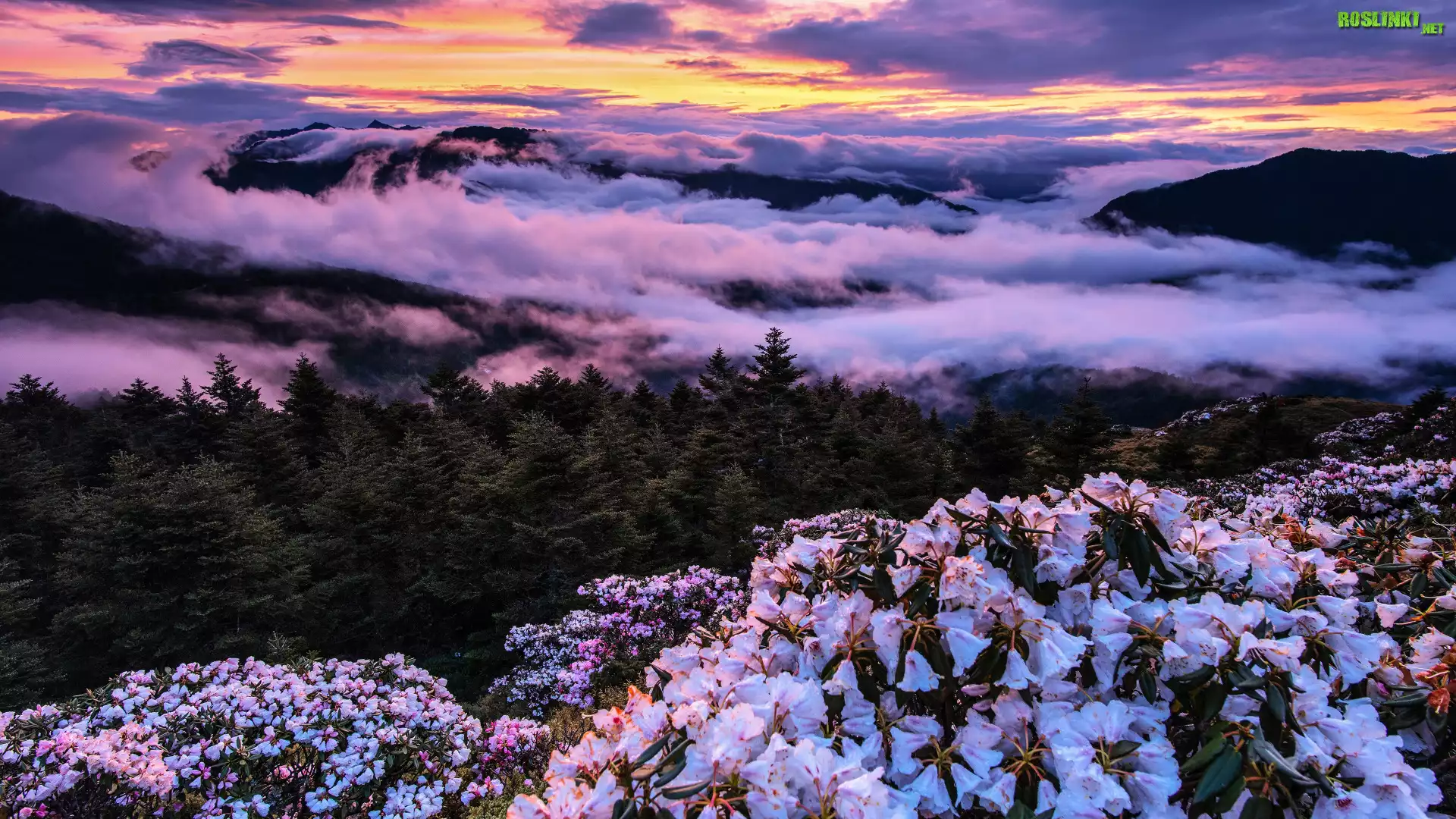 Rośliny: Las, Drzewa, Niebo, Mgła, Góry, Kwiaty, Różanecznik, Zachód słońca