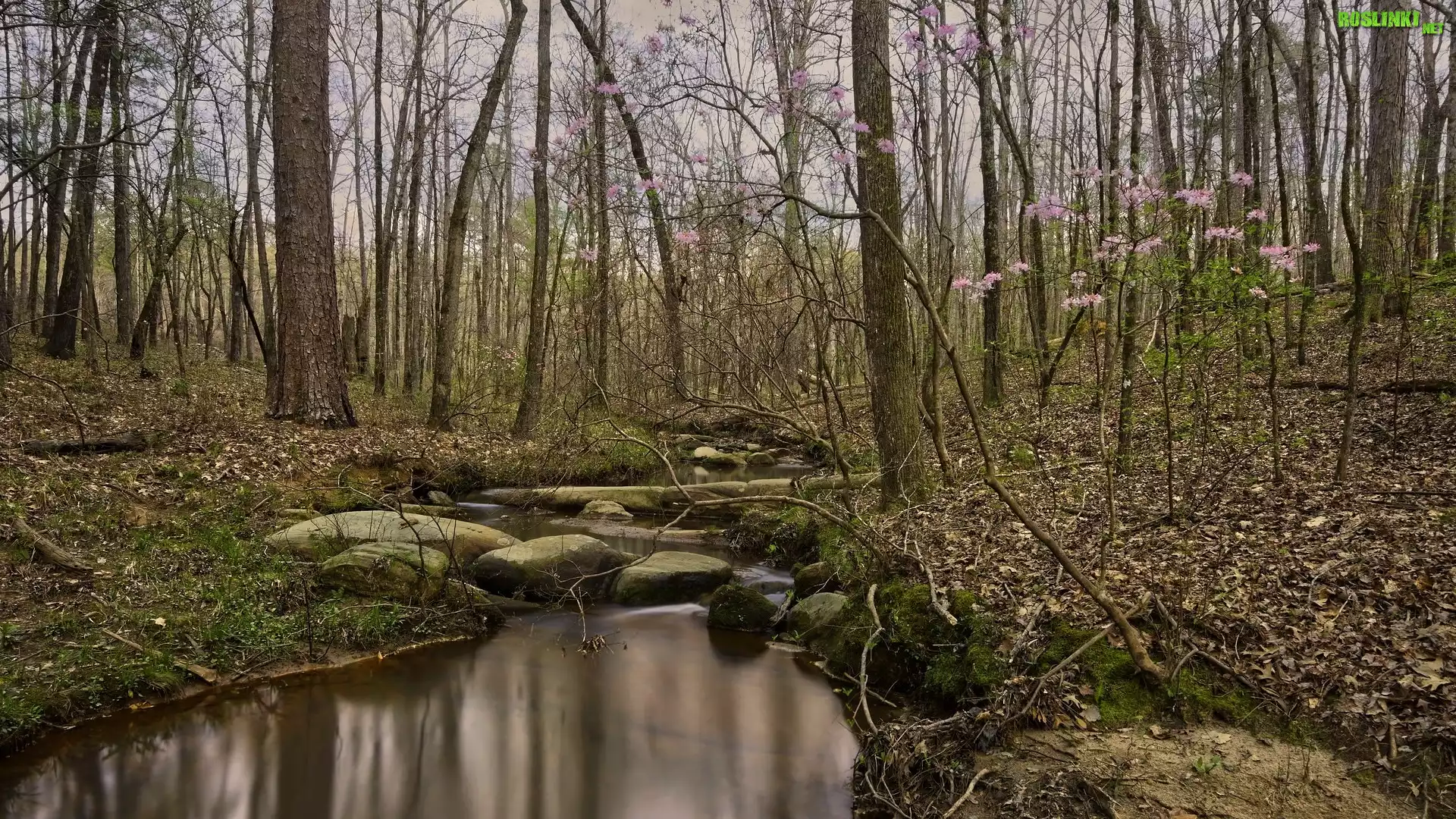 Rośliny: Las, Drzewa, Okwiecone, Gałązki, Rzeka, Kamienie