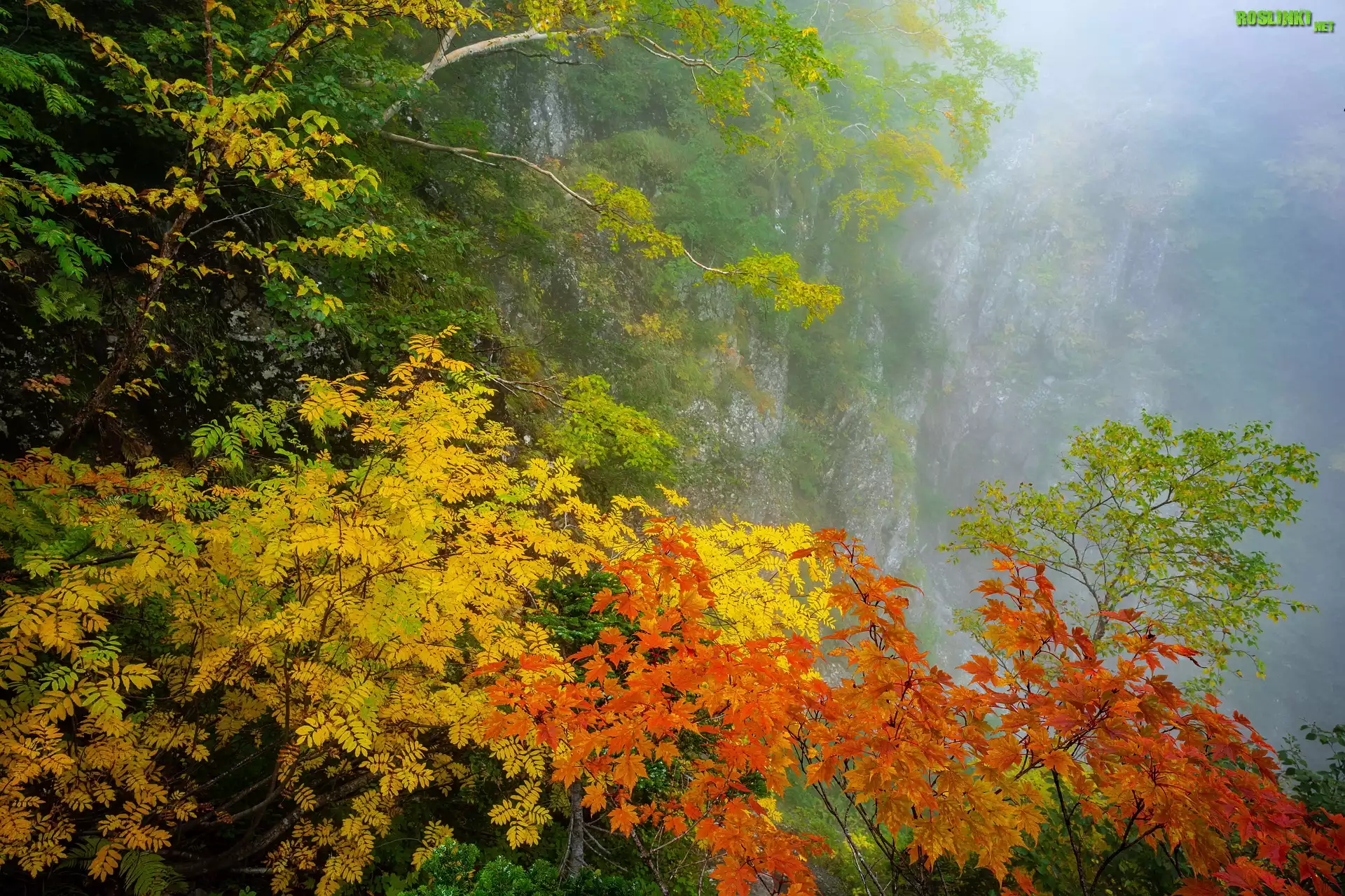 Rośliny: Jesień, Las, Drzewa, Gałęzie, Kolorowe, Liście, Mgła, Skała