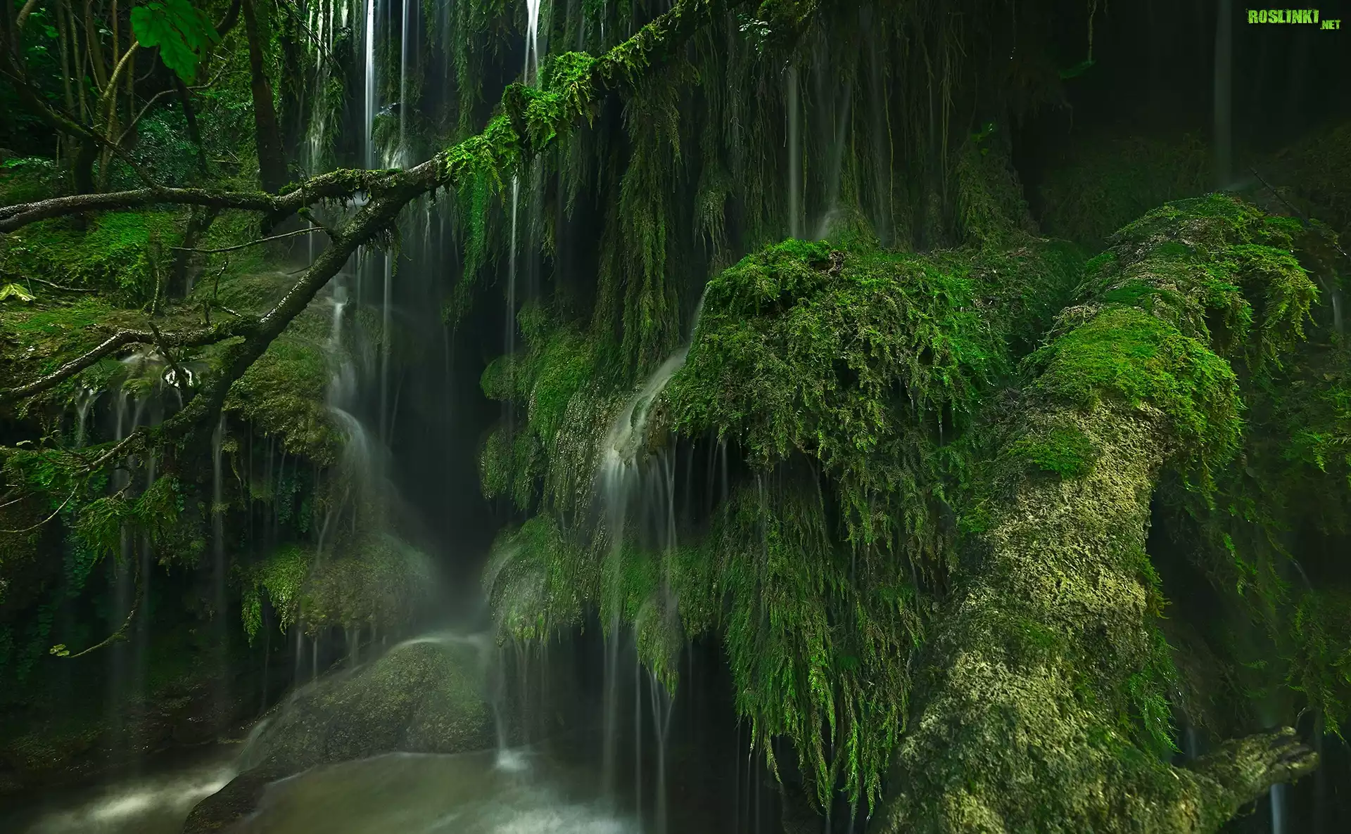 Rośliny: Las, Wodospad, Drzewo, Gałąź, Skały, Mech