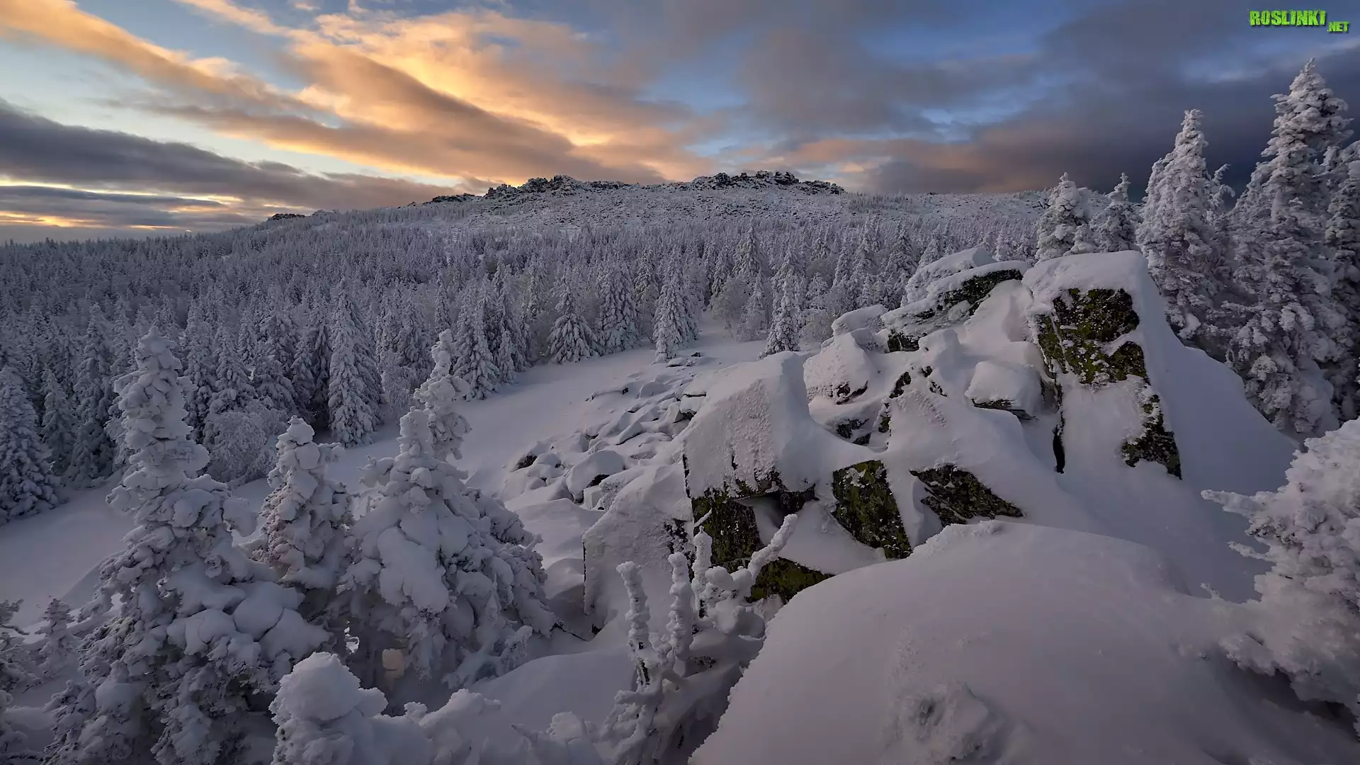 Rośliny: Las, Zima, Ośnieżone, Drzewa, Skały, Chmury