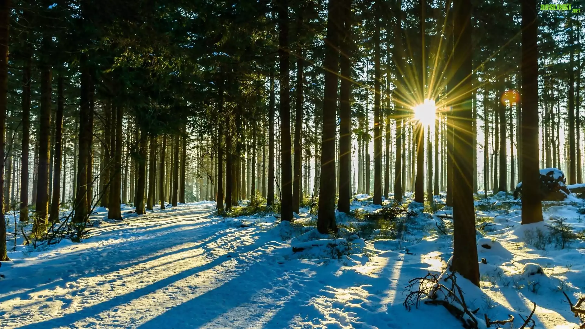 Rośliny: Las, Droga, Drzewa, Promienie słońca, Zima