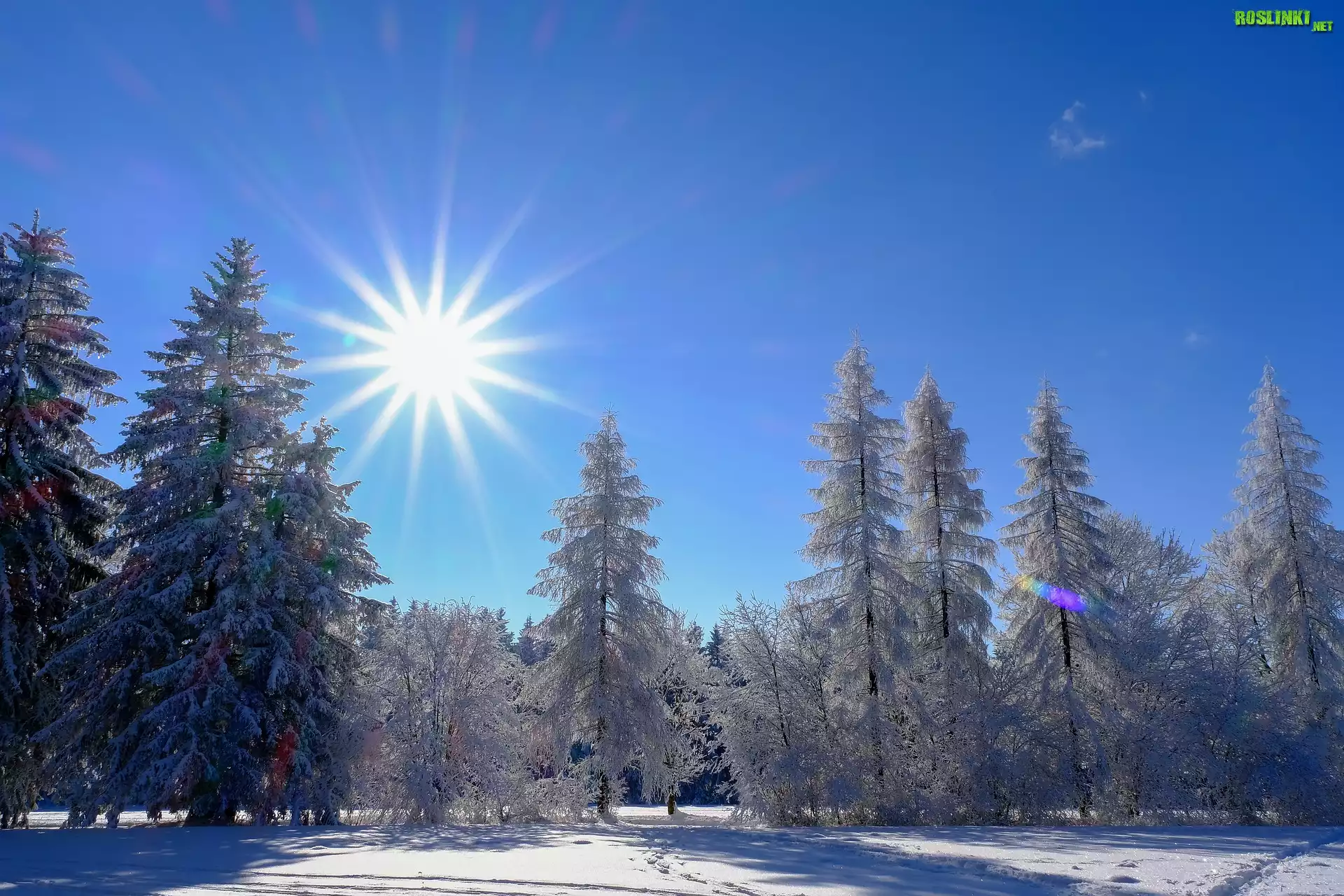 Rośliny: Zima, Las, Drzewa, Śnieg, Błękitne, Niebo, Promienie słońca