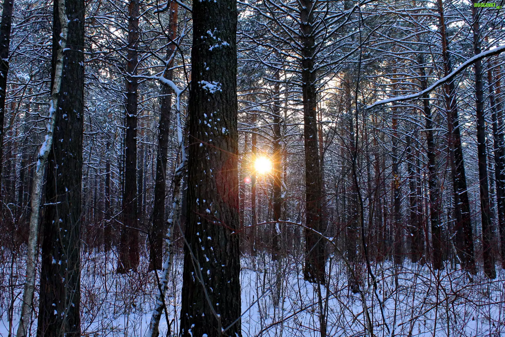 Las, Drzewa, Prześwitujące, Słońce, Zima