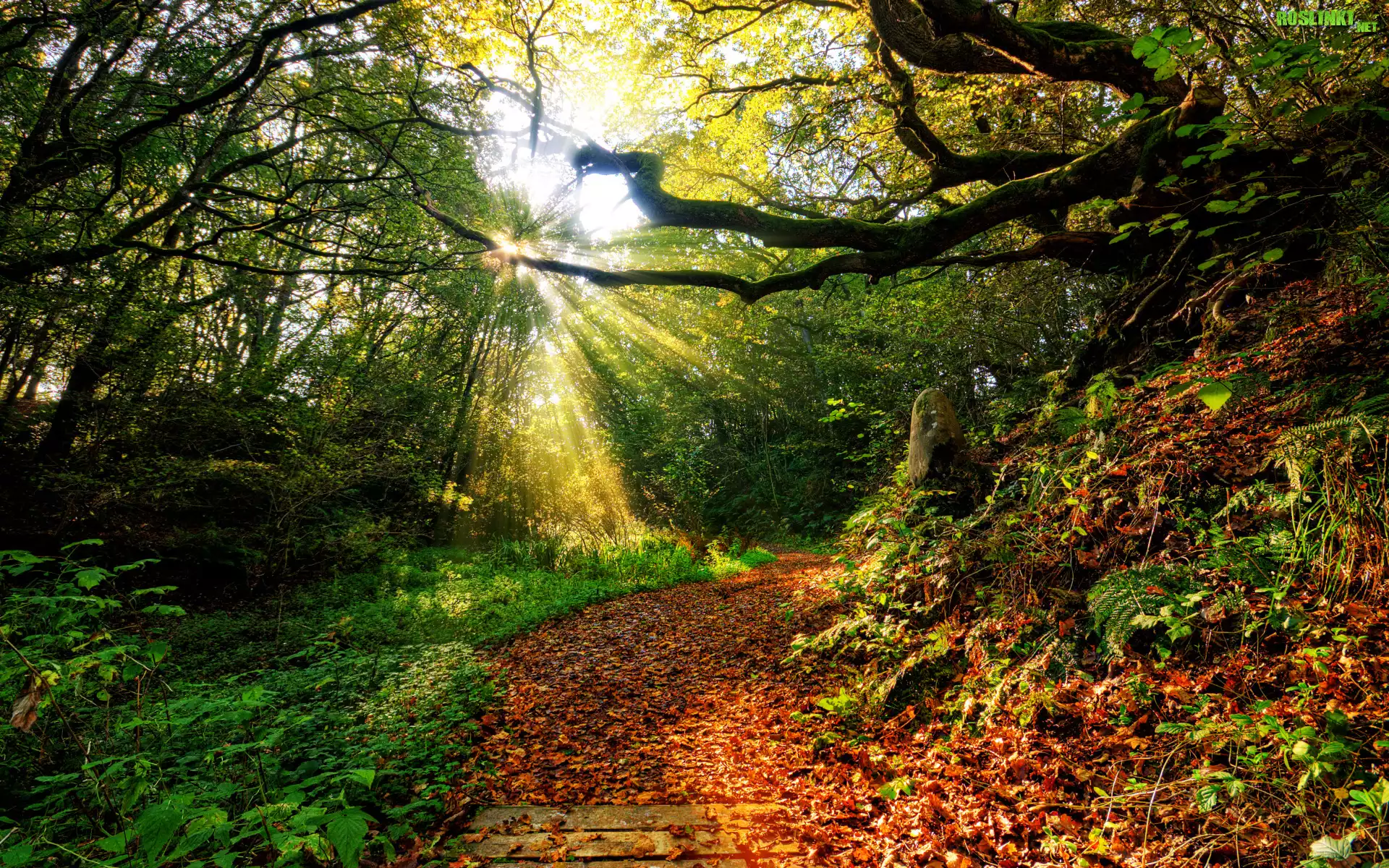 Rośliny: Jesień, Las, Drzewa, Gałęzie, Ścieżka, Przebijające światło, Słoneczne