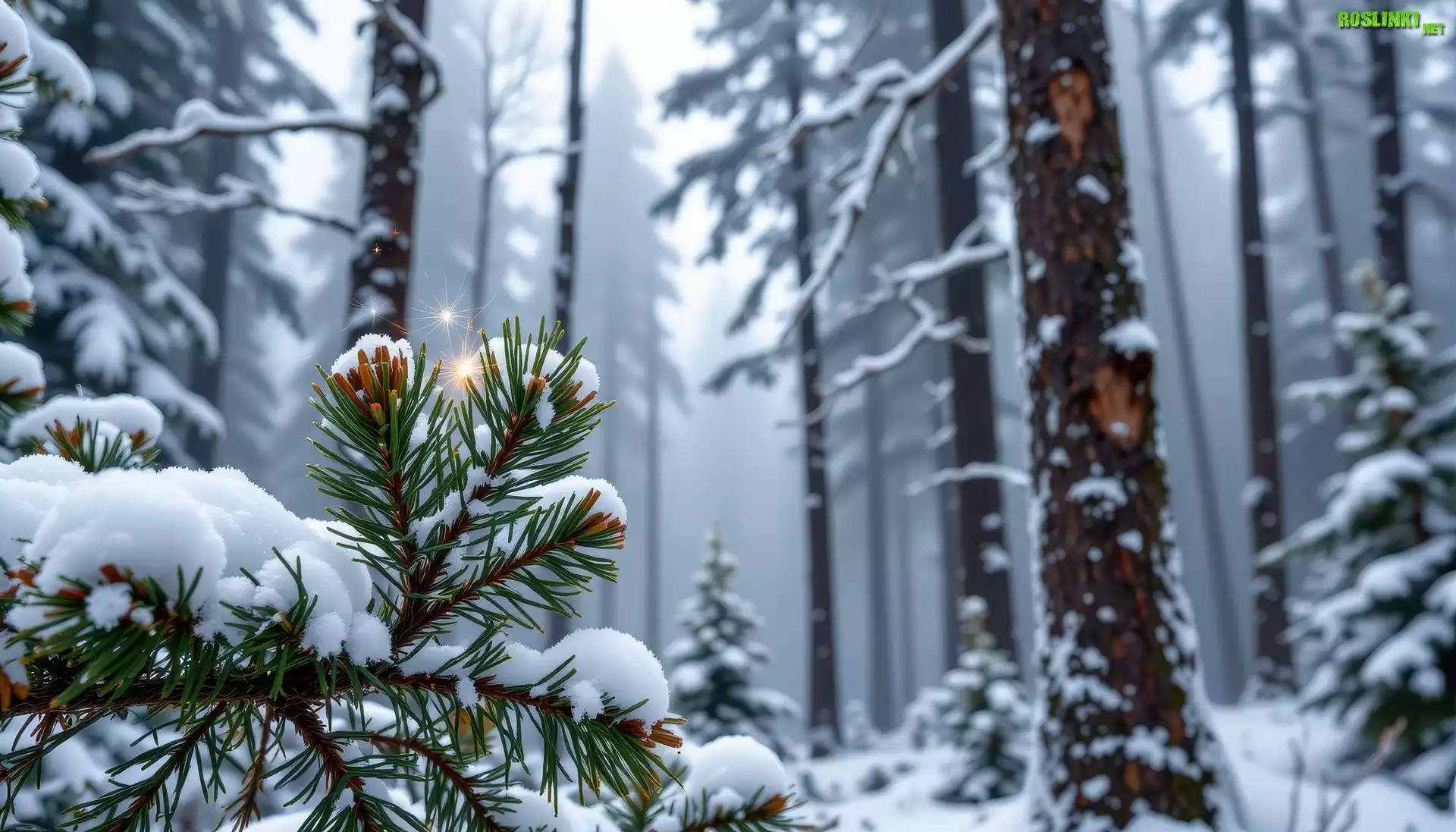 Rośliny: Gałązka, Sosna, Śnieg, Las, Zima, Grafika AI