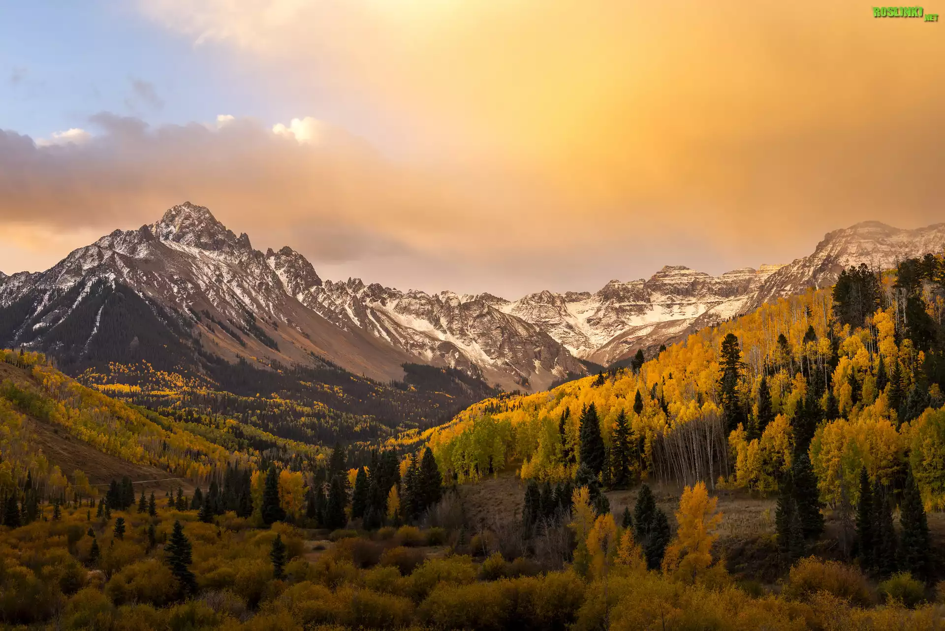 Jesień, Kolorowe, Drzewa, Las, Góry, Mount Sneffels, Wschód słońca, Stan Kolorado, Stany Zjednoczone |