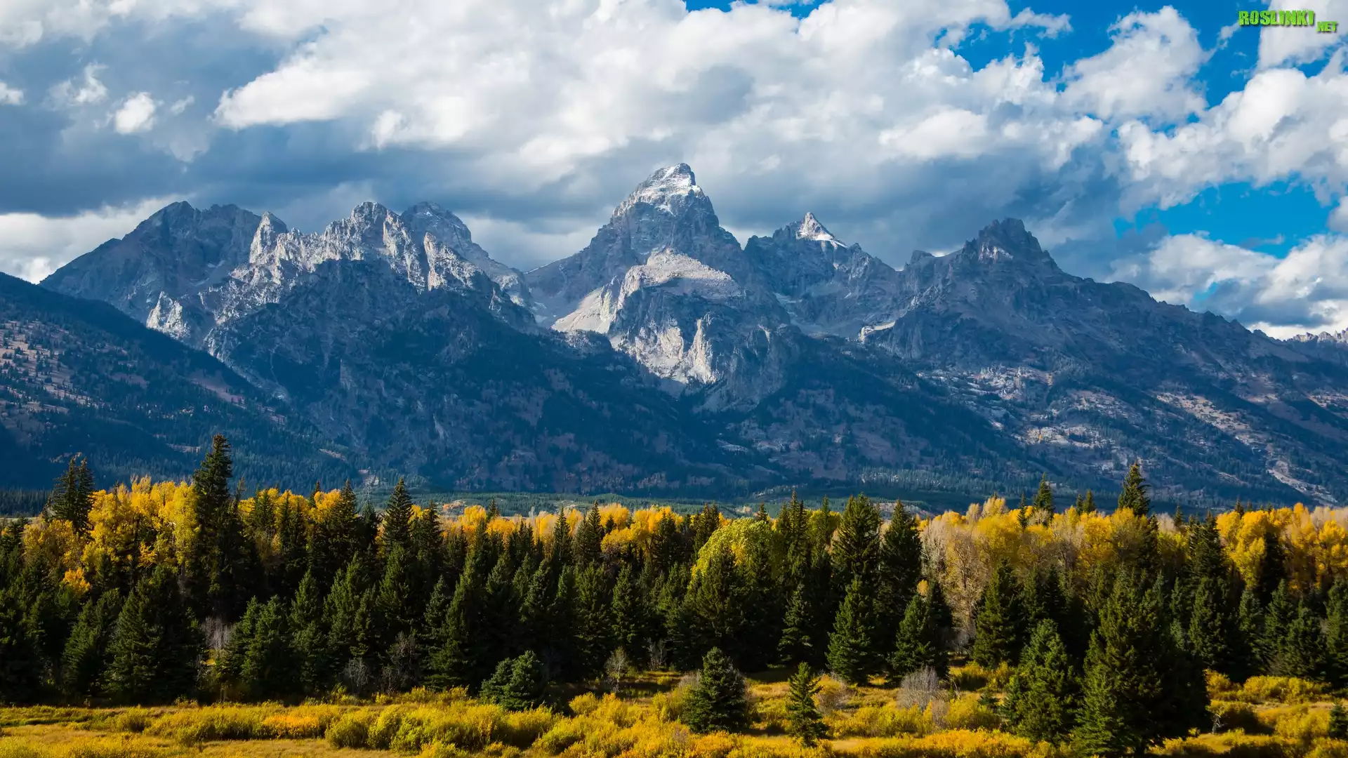 Rośliny: Stany Zjednoczone, Utah, Park Narodowy Grand Teton, Góry, Chmury, Las, Drzewa, Jesień