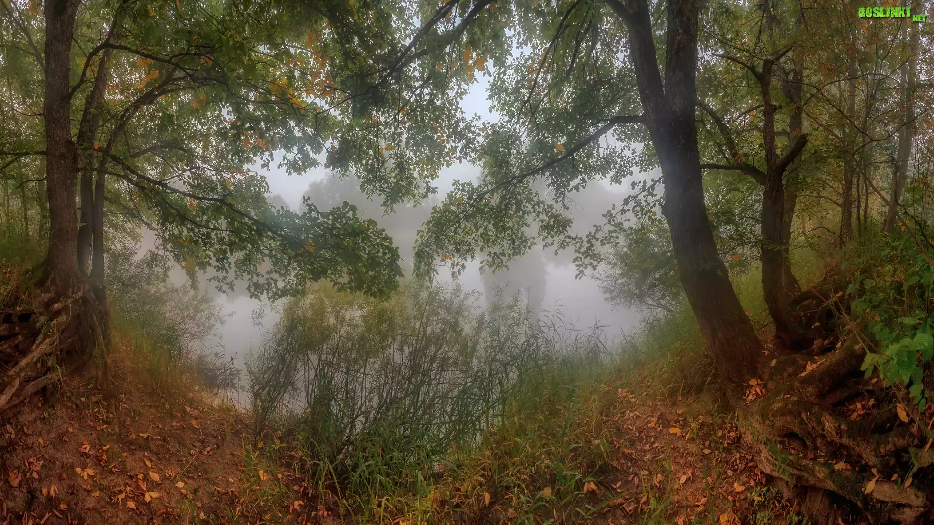 Rośliny: Las, Mgła, Drzewa, Trawy, Zamglone, Jezioro