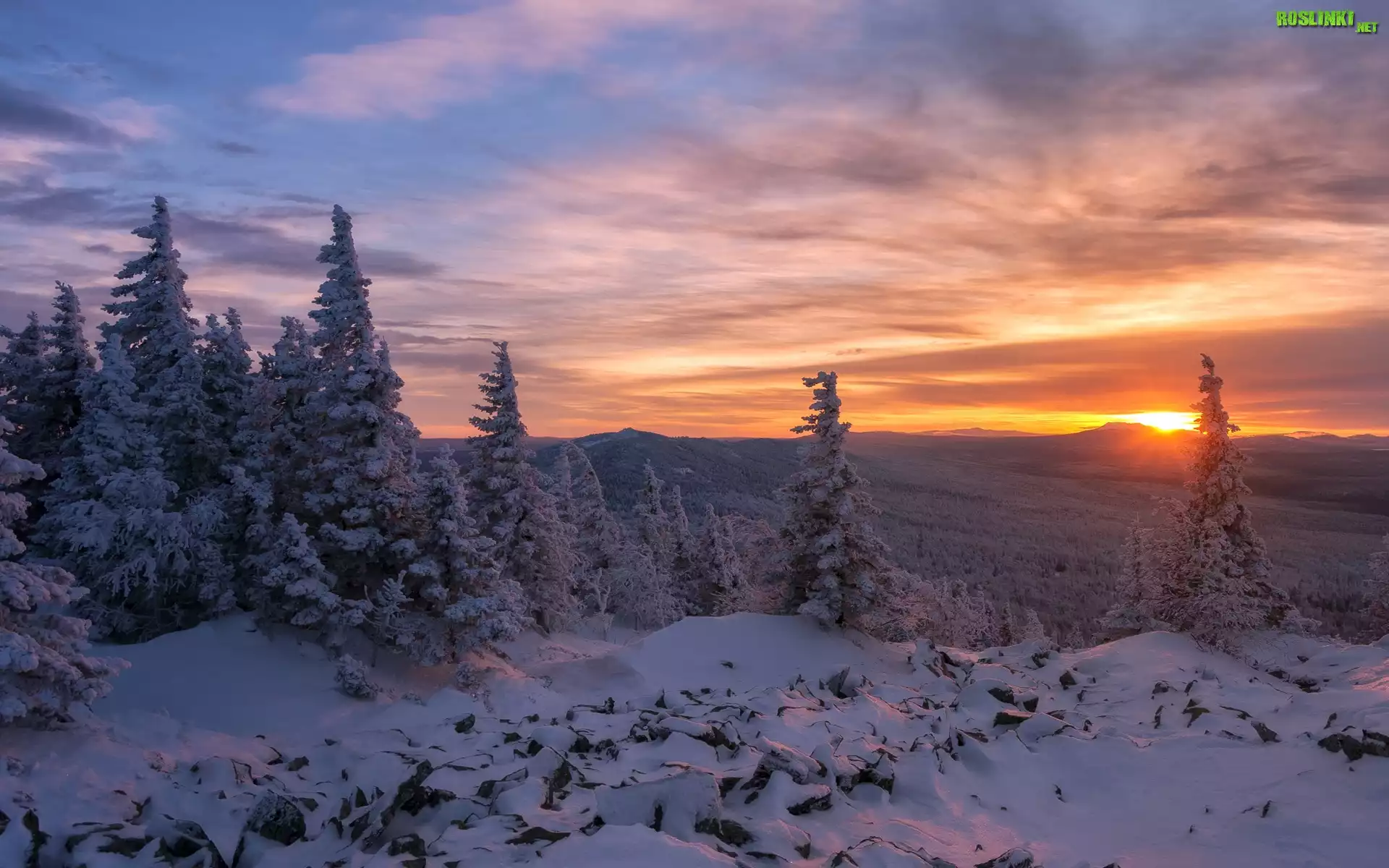 Rośliny: Zima, Las, Ośnieżone, Drzewa, Zachód słońca, Chmury