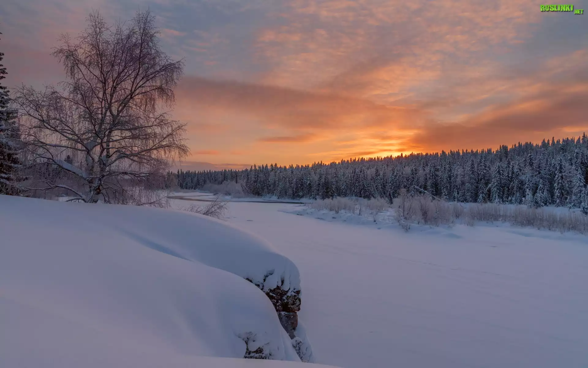 Rośliny: Zima, Zaśnieżona, Rzeka Peczora, Drzewa, Las, Zachód słońca, Chmury, Republika Komi, Rosja