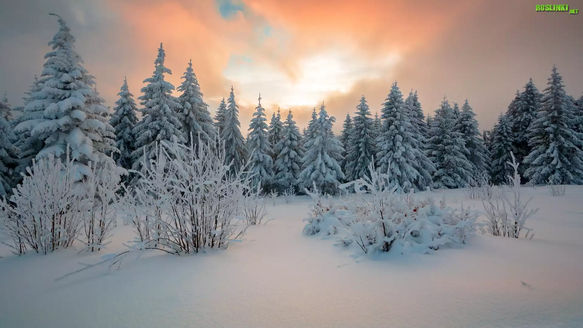 Rośliny: Zima, Las, Świerki, Krzewy, Chmury, Zachód słońca