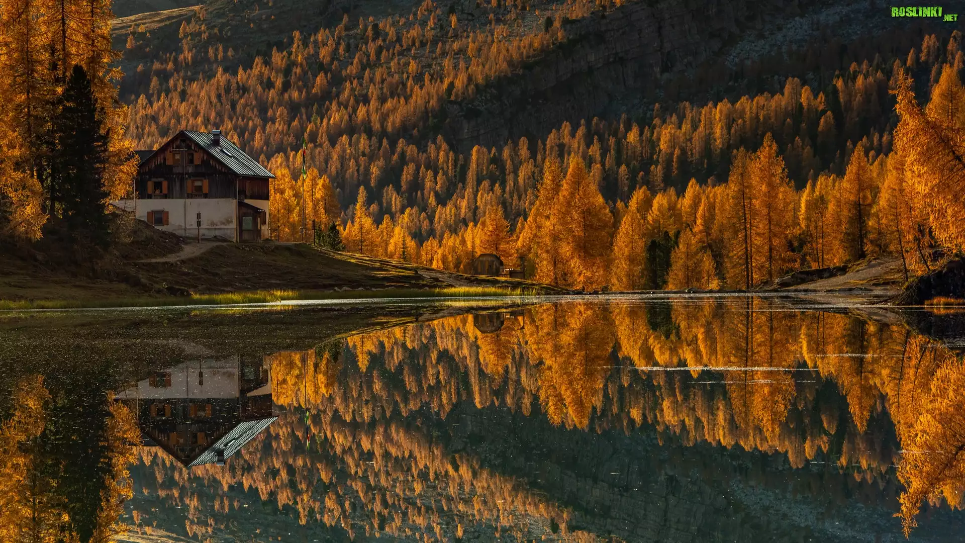 Rośliny: Jesień, Jezioro, Lago Federa, Góra, Dom, Las, Żółte, Drzewa, Modrzewie, Włochy
