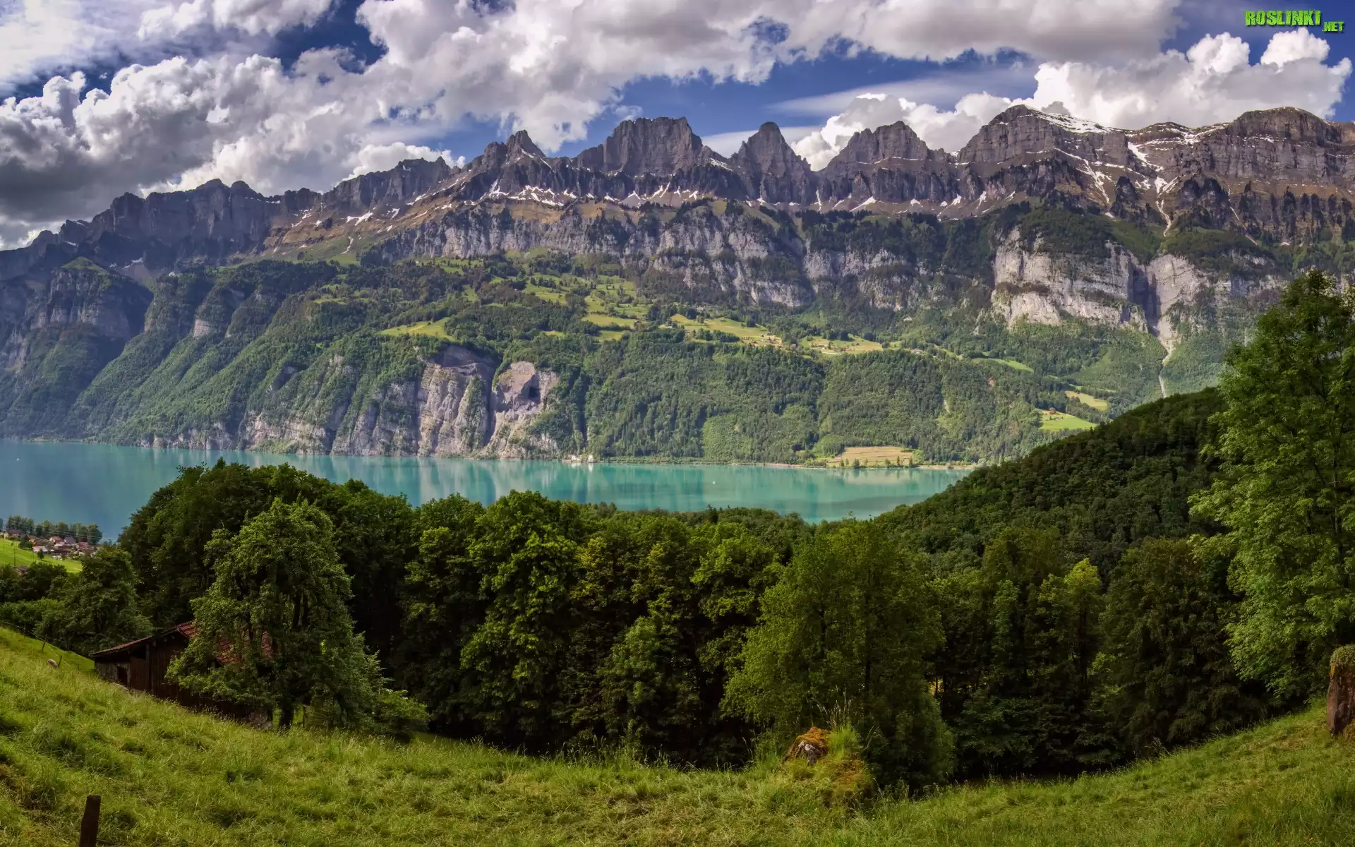 Lasy, Drzewa, Góry, Alpy, Pasmo górskie, Churfirsten, Jezioro, Walensee, Łąka, Trawa, Chmury, Szwajcaria |