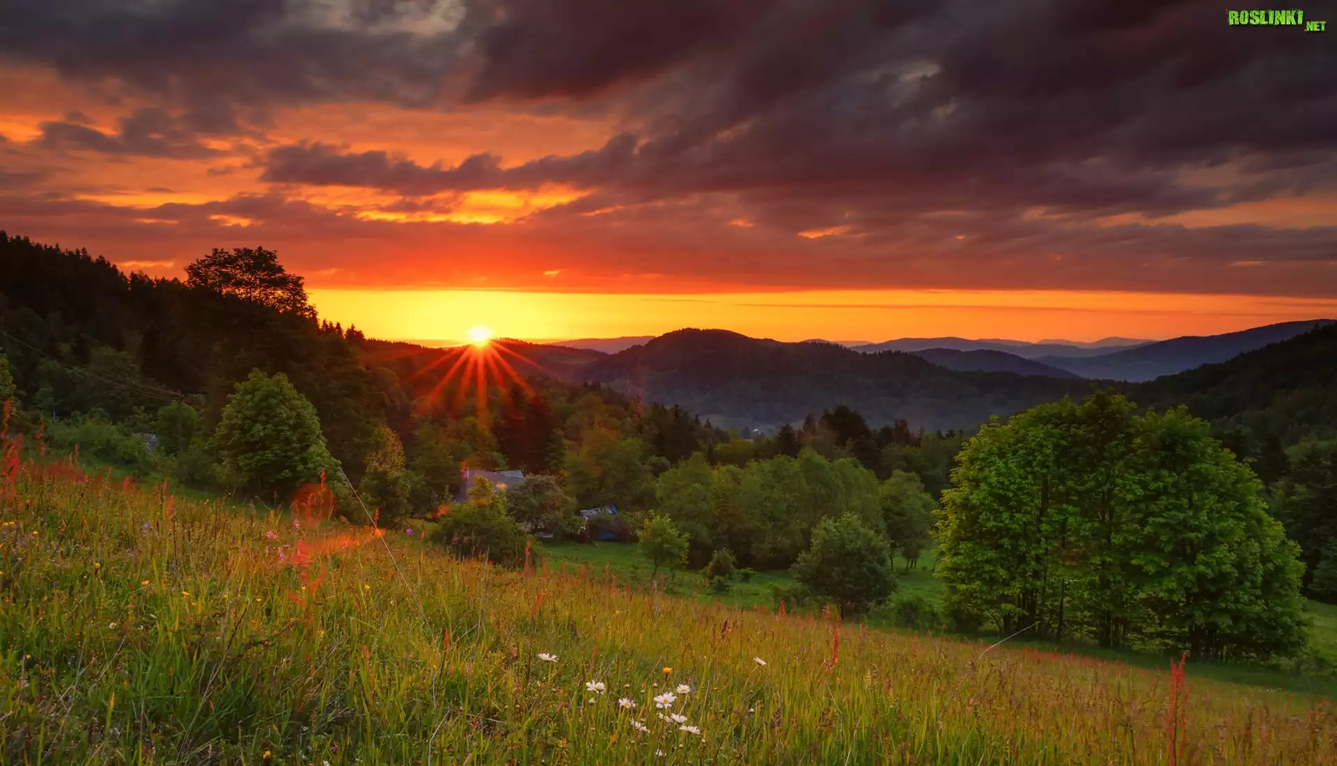 Rośliny: Góry, Lasy, Drzewa, Łąka, Zachód słońca, Chmury