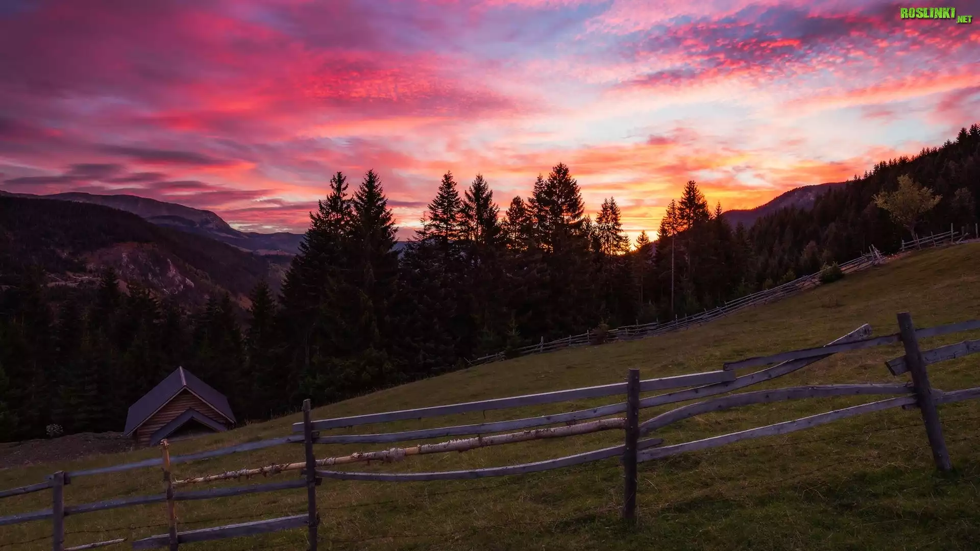 Rośliny: Góry, Lasy, Drzewa, Dom, Polana, Ogrodzenie, Zachód słońca