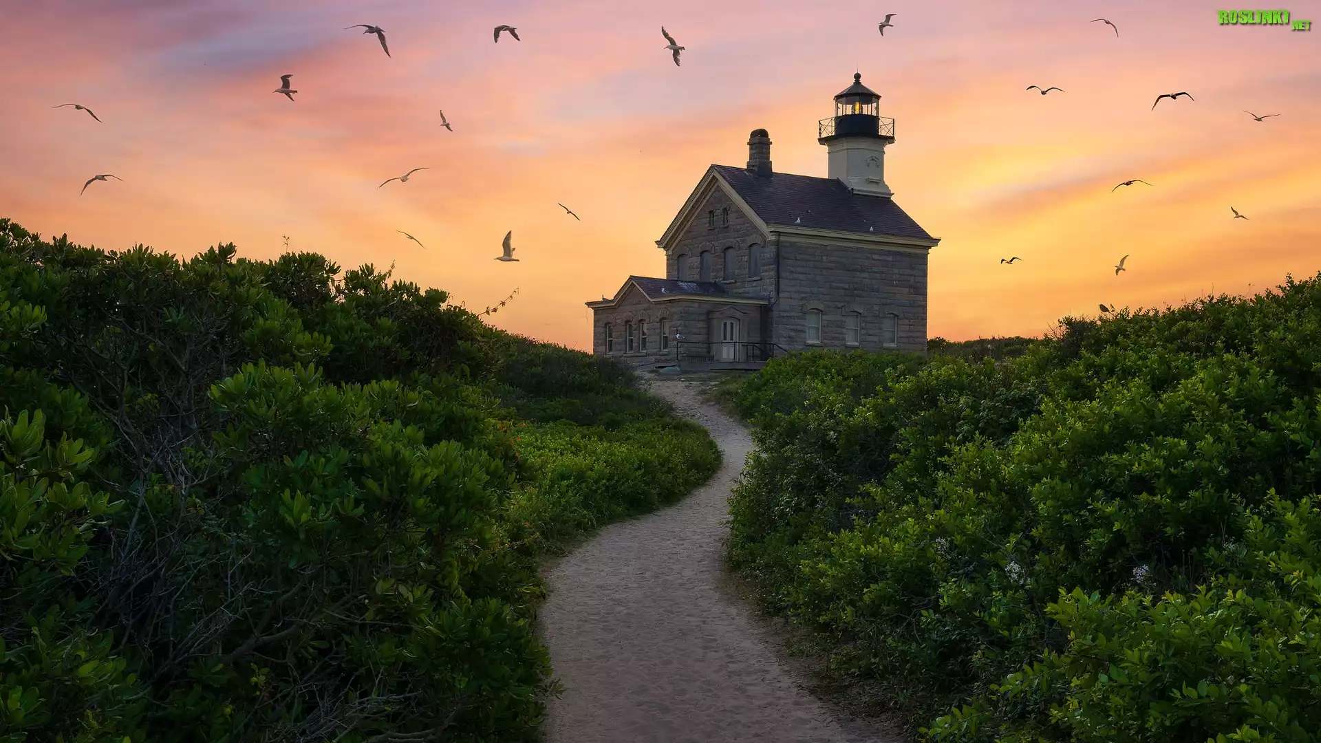 Stany Zjednoczone, Stan Rhode Island, Morze, Droga, Latarnia morska, Block Island North Light, Krzewy, Mewy |