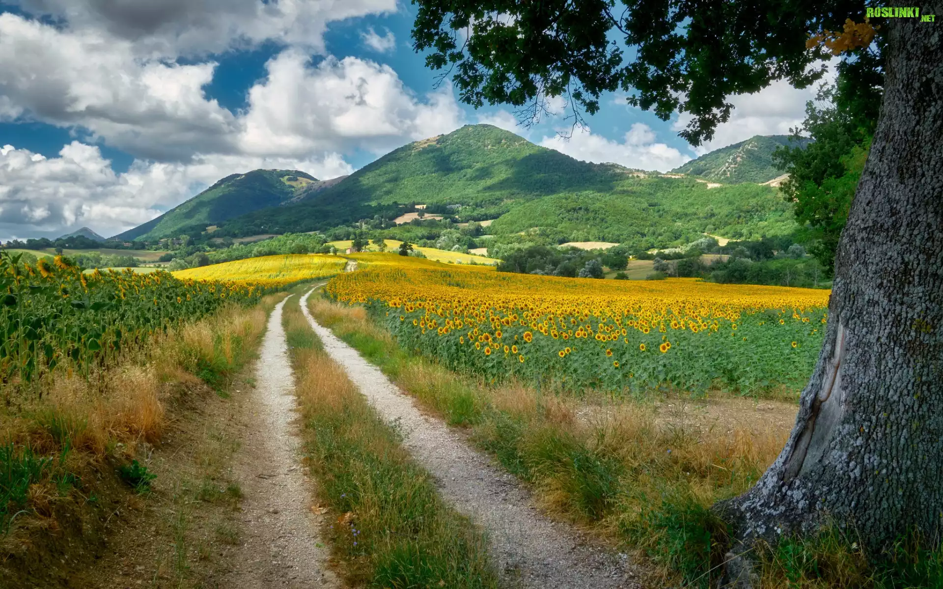 Rośliny: Pole, Droga, Kwiaty, Słoneczniki, Drzewa, Góry, Chmury, Lato