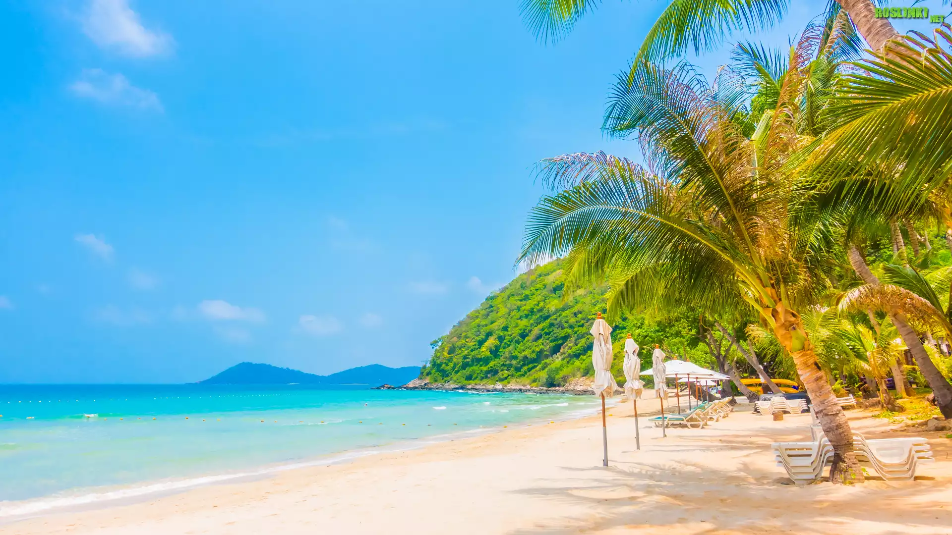 Rośliny: Lato, Wybrzeże, Plaża, Morze, Leżaki, Parasole, Wzgórza, Roślinność, Palmy, Niebo