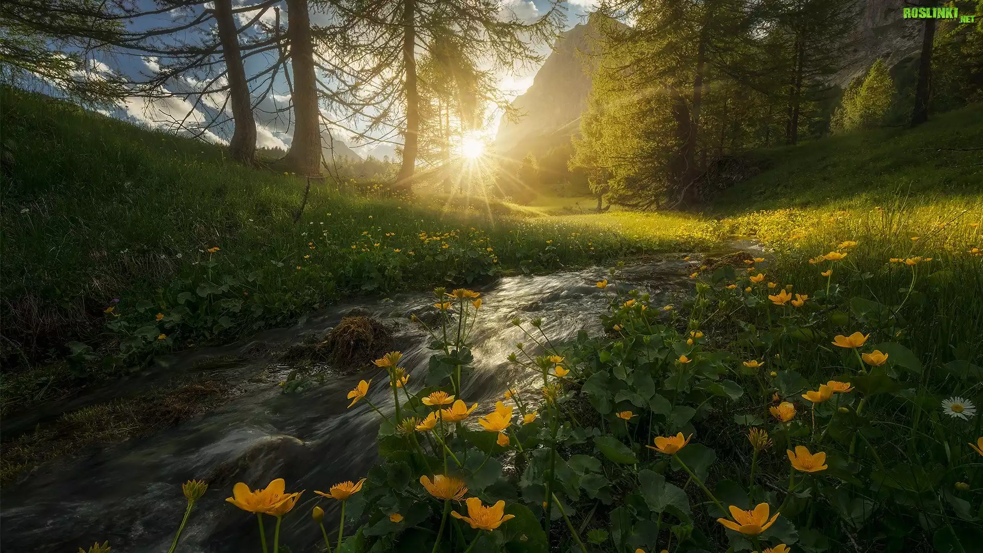 Rośliny: Lato, Wschód słońca, Góry, Rzeka, Drzewa, Żółte, Kwiaty, Promienie słońca