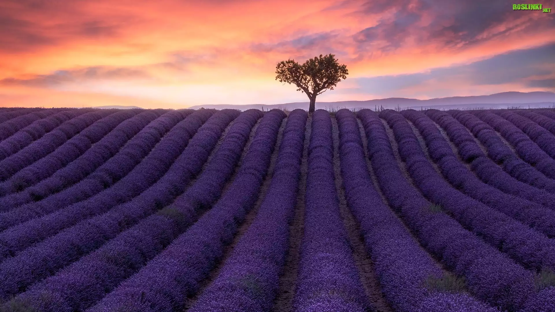 Rośliny: Pole, Lawenda, Drzewo, Zachód słońca, Kolorowe, Niebo