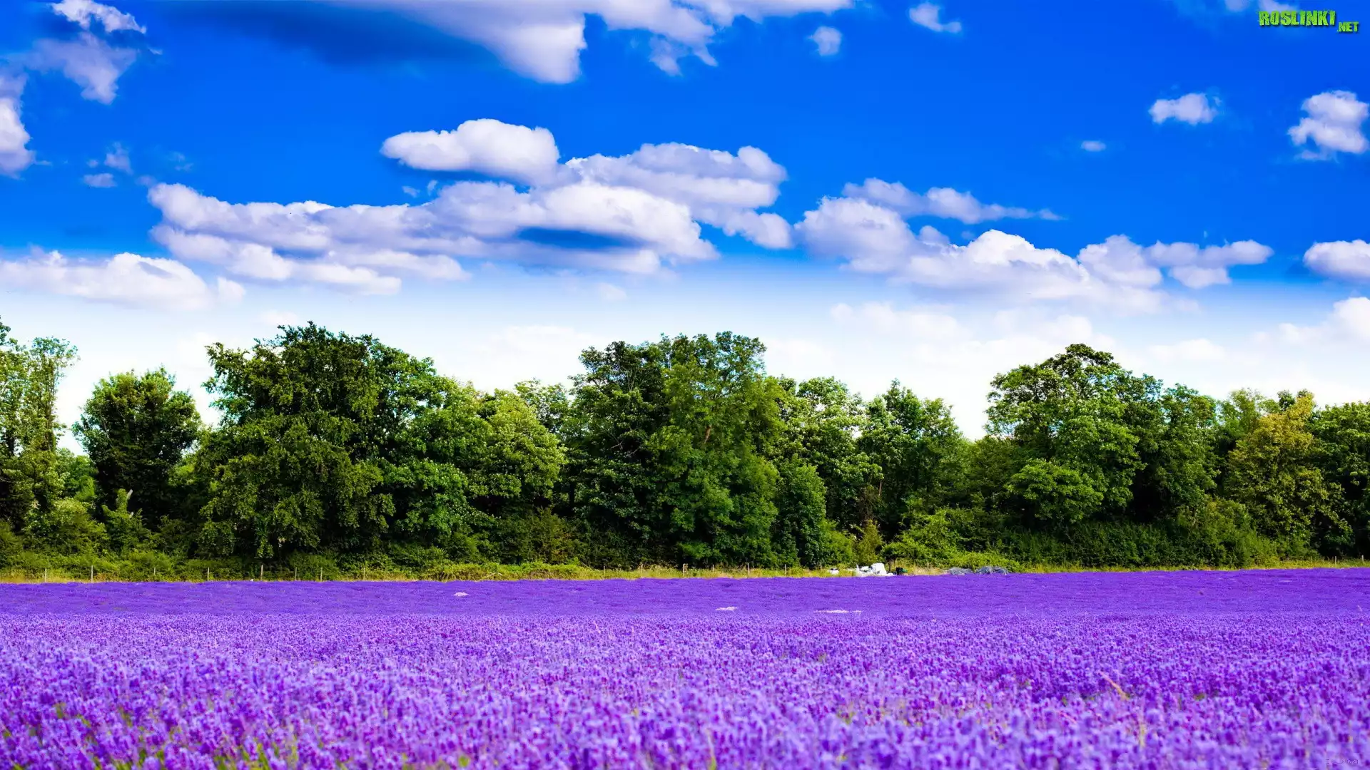 Rośliny: Lawendowe, Pole, Chmury, Drzewa