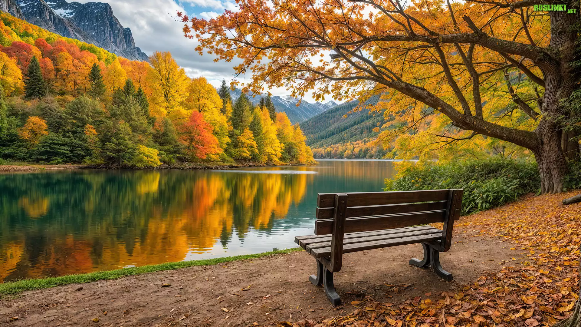 Rośliny: Jesień, Drzewo, Jezioro, Ławka, Góra, Chmura, Liść