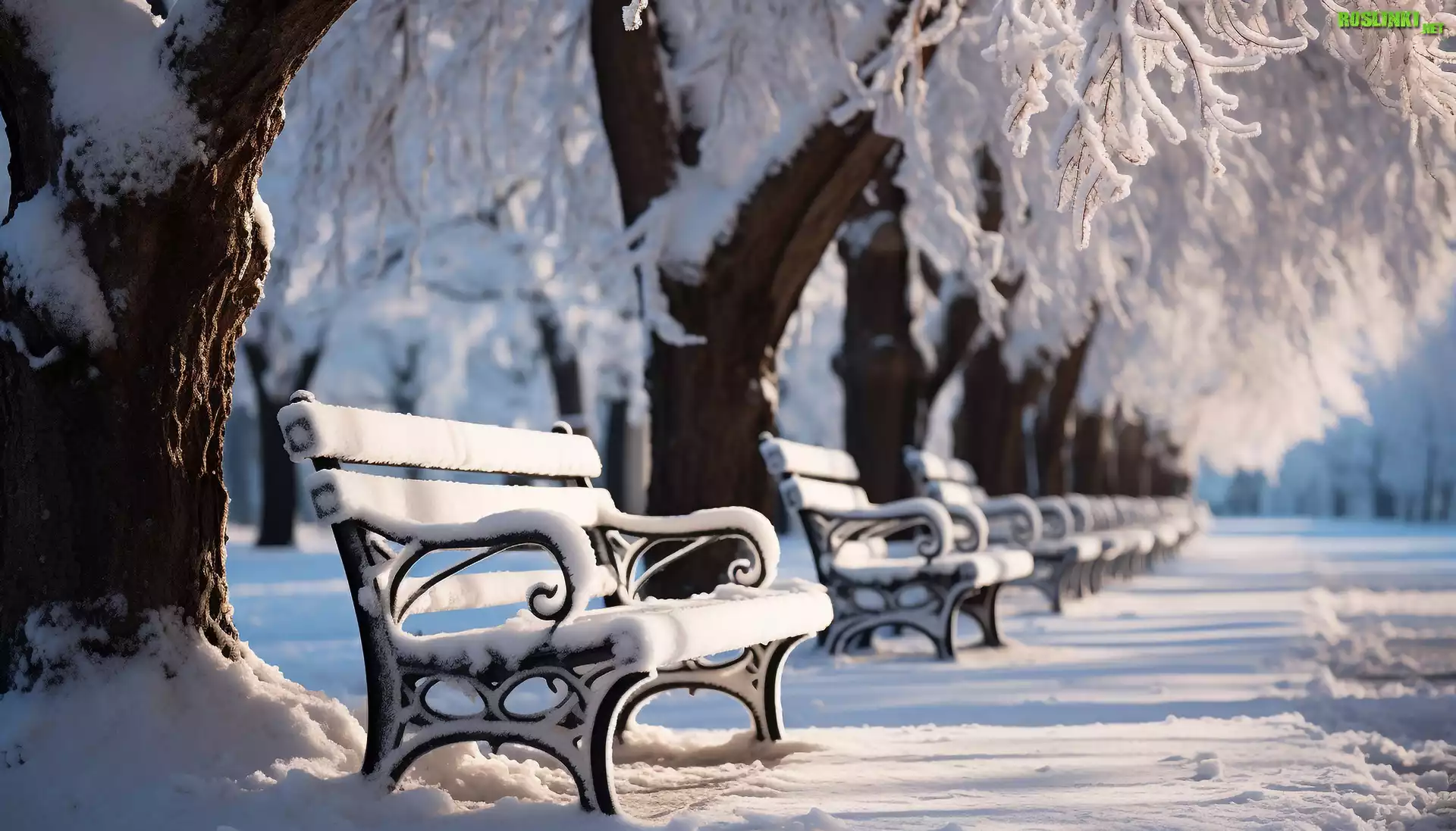 Rośliny: Zima, Ławki, Park, Drzewa, Grafika