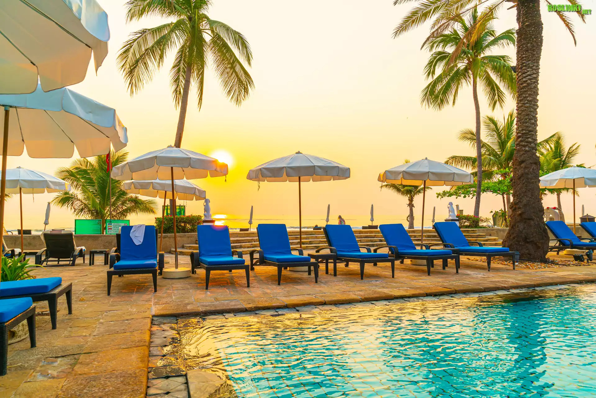 Rośliny: Basen, Leżaki, Parasole, Palmy, Tropiki