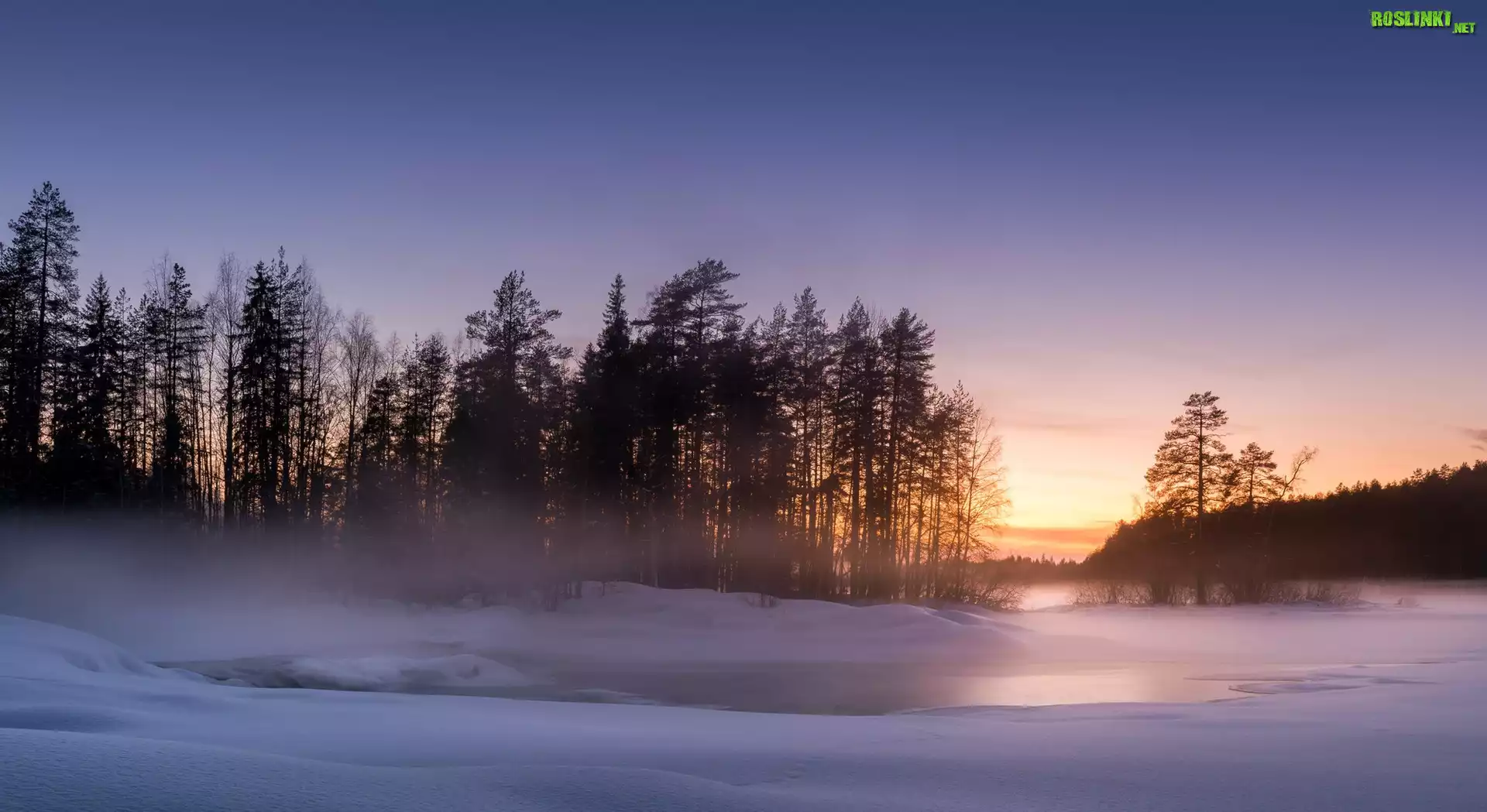 Finlandia, Karelia Północna, Miasto Lieksa, Ruunaa, Rzeka Neitikoski Rapid, Zima, Drzewa, Mgła, Zachód słońca |