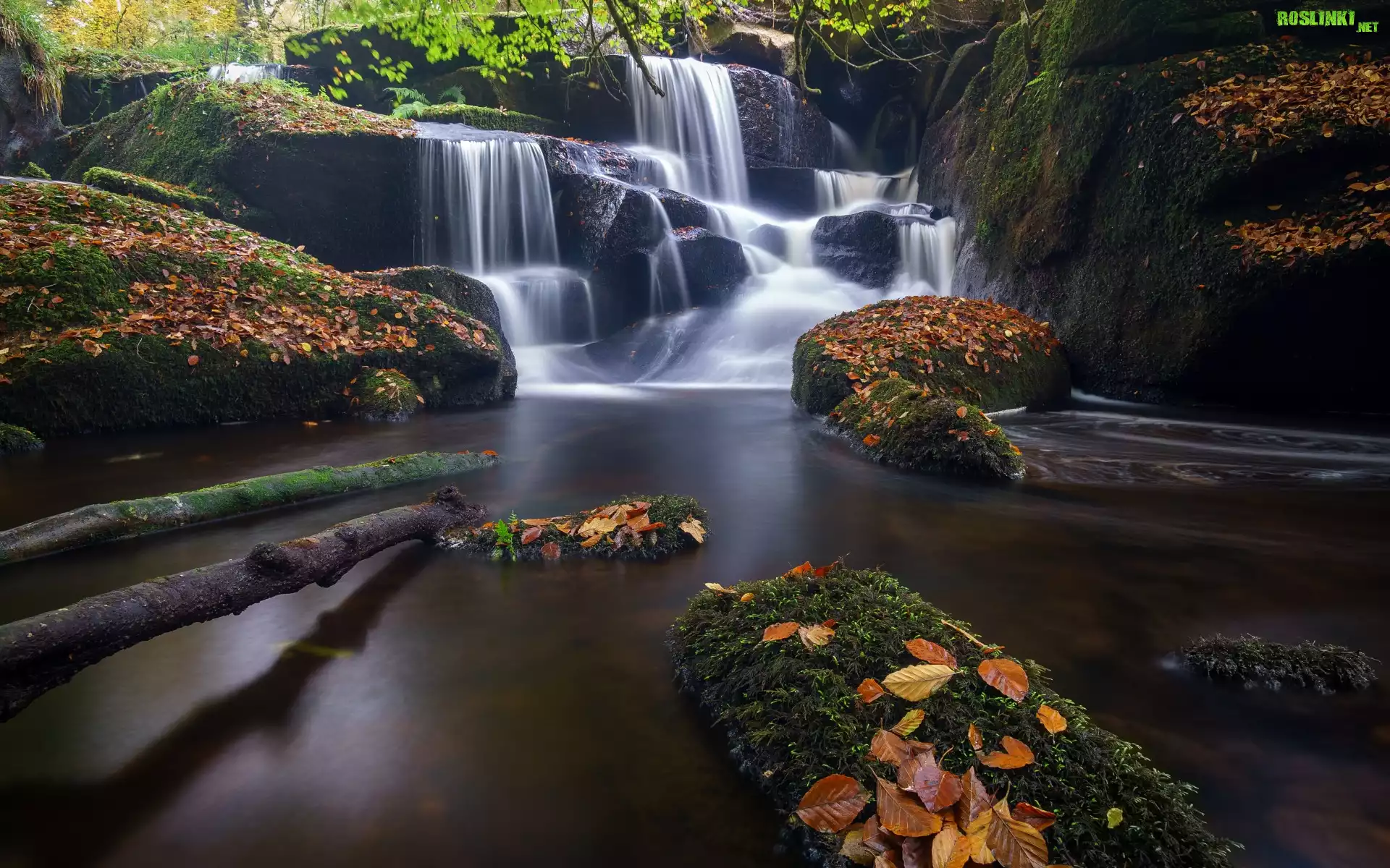 Francja, Bretania, Saint-Herbot, Jesień, Liście, Rzeka, Kamienie, Omszałe, Skały, Wodospad, Roślinność |