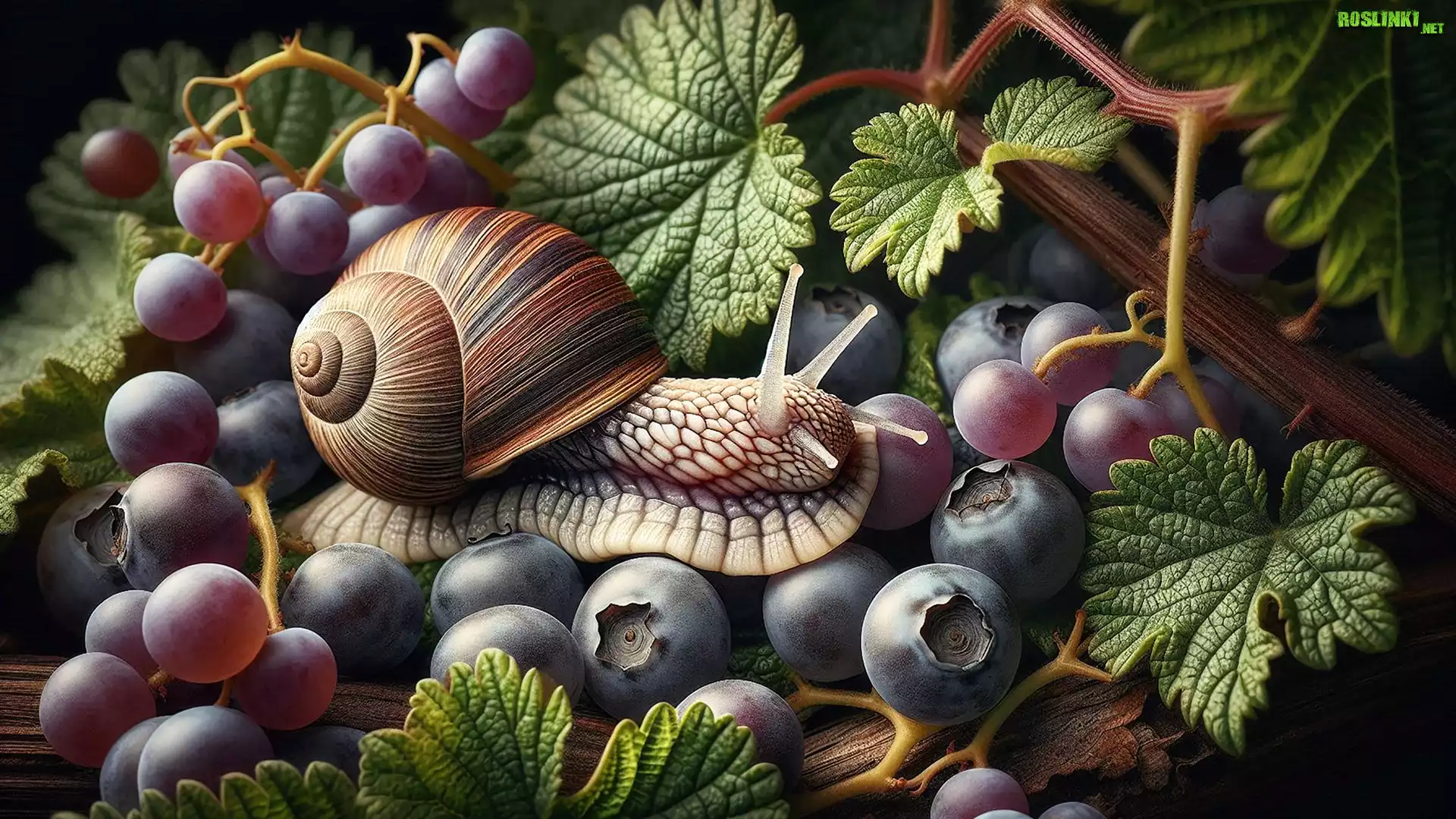 Rośliny: Ślimak, Owoce, Winogrona, Liście, Borówki, Grafika