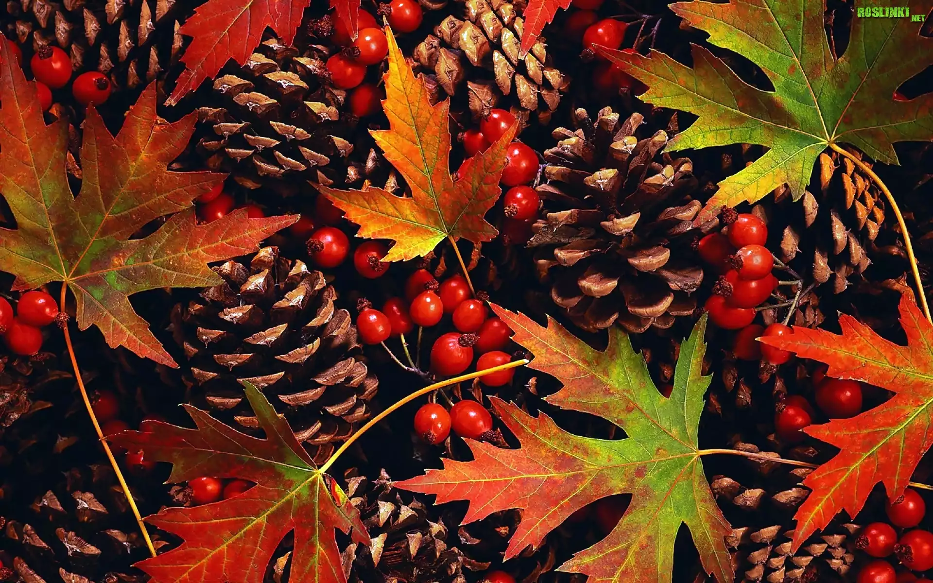 Rośliny: Liście, Szyszki, Jarzębina, Jesień, Tło