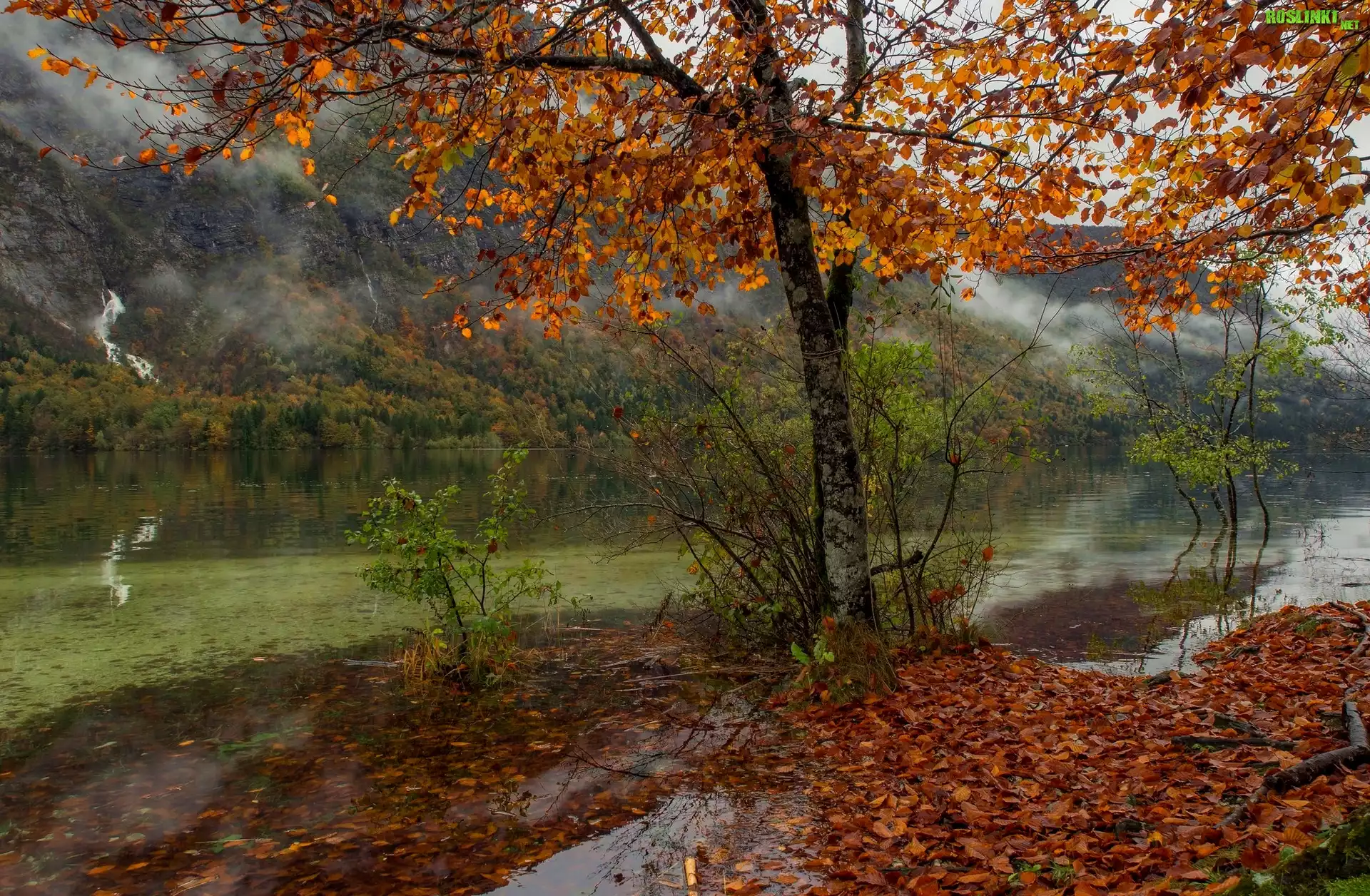Rośliny: Słowenia, Park Narodowy Triglav, Jesień, Drzewo, Góry, Jezioro Bohinjsko, Liście