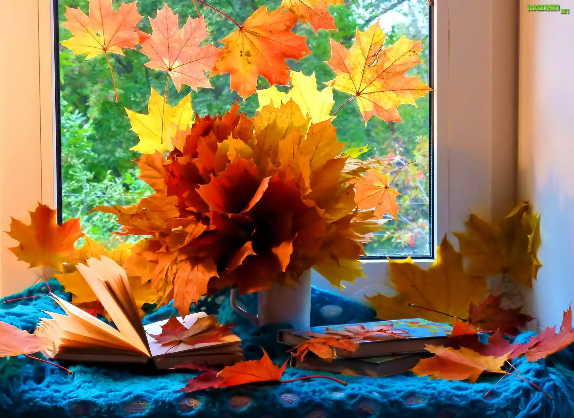 Rośliny: Jesienne, Liście, Bukiet, Książki, Okno, Martwa, Natura
